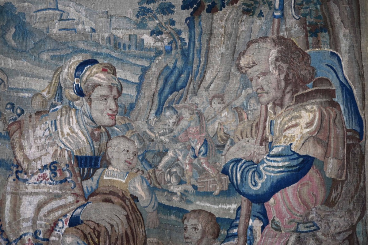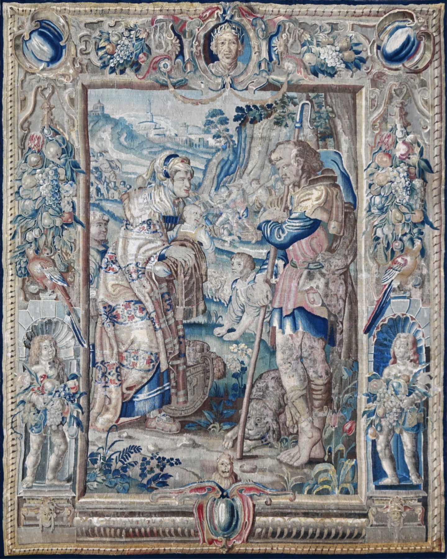 Après avoir fui l'Égypte, Moïse trouve refuge dans le désert de Madian. C’est là qu’il rencontre Séphora, la fille du prêtre Jéthro. La tapisserie illustre l’instant paisible de leur vie familiale : Séphora présente à son époux leur fils premier-né, Gershom.