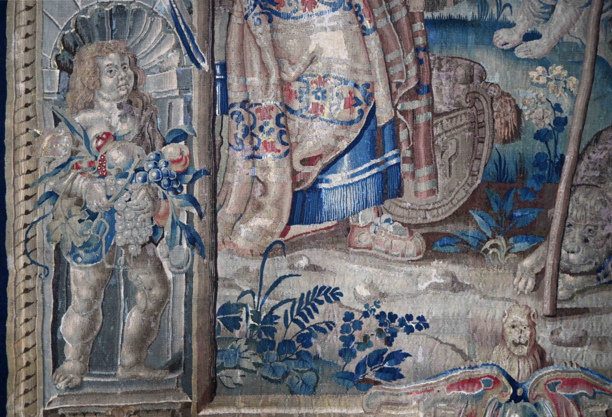 Le décor environnant, un paysage vallonné baigné d'une lumière douce, renforce l'atmosphère pastorale. L’ensemble est magnifié par une bordure d'une richesse exceptionnelle : un cadre architectural orné de guirlandes de fruits, de putti tenant des cornes d'abondance et, au sommet, un médaillon arborant un buste lauré « à l'antique ». Cette bordure transforme la scène en une fenêtre ouverte sur un passé héroïque, marquant l'appartenance de l'œuvre à une série de grand prestige.