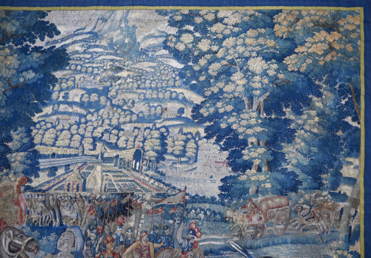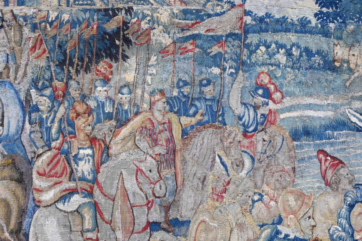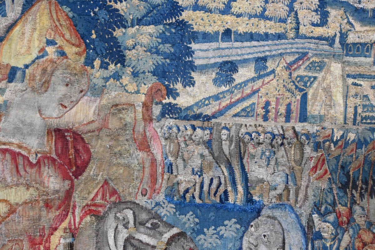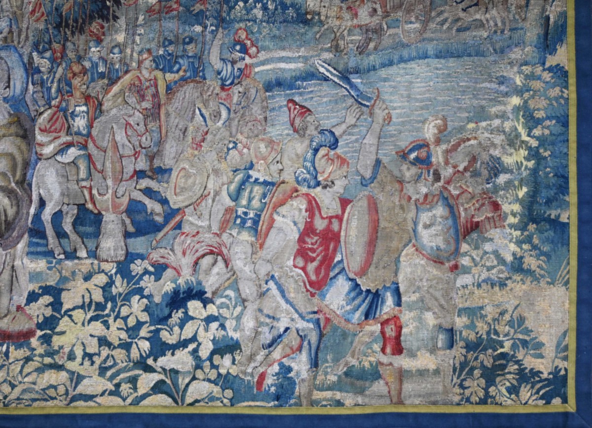 Note historique : À la fin du XVIe siècle, Bruxelles est le centre mondial de la tapisserie. Ces œuvres n'étaient pas seulement décoratives ; elles servaient de propagande politique et religieuse pour les souverains, illustrant leur piété et leur puissance militaire.