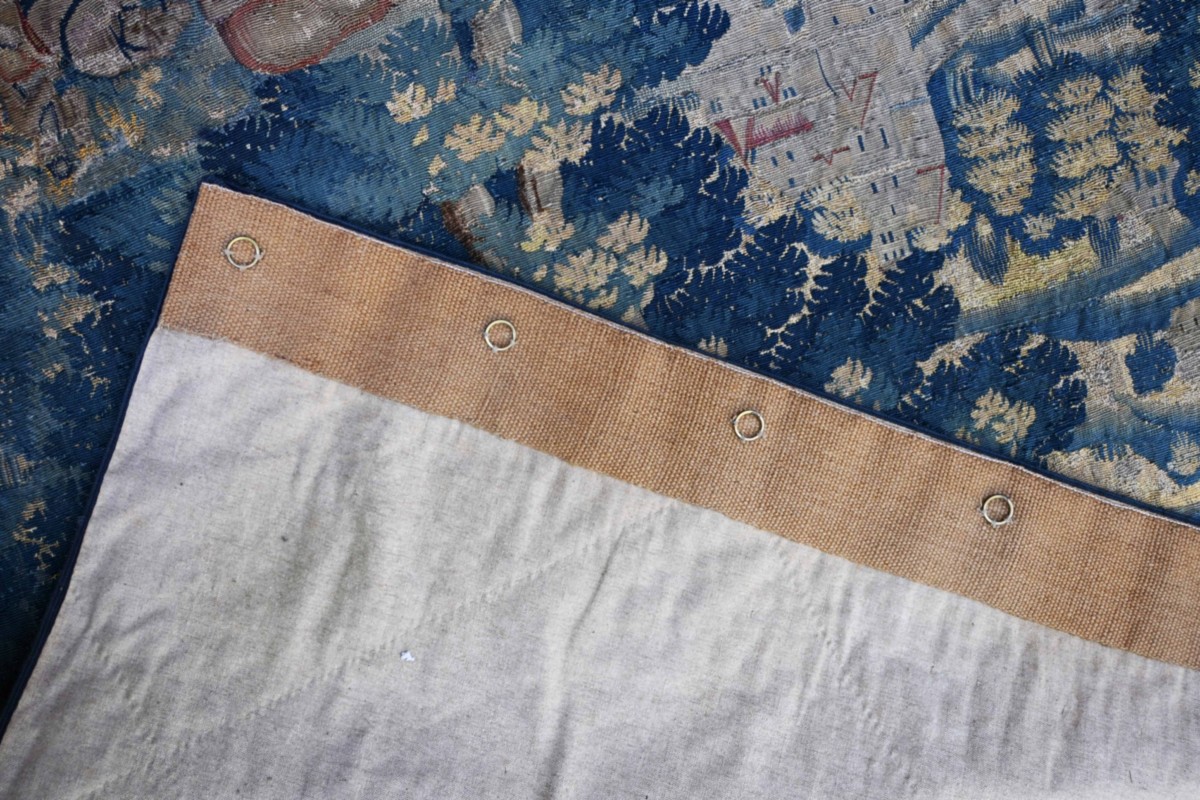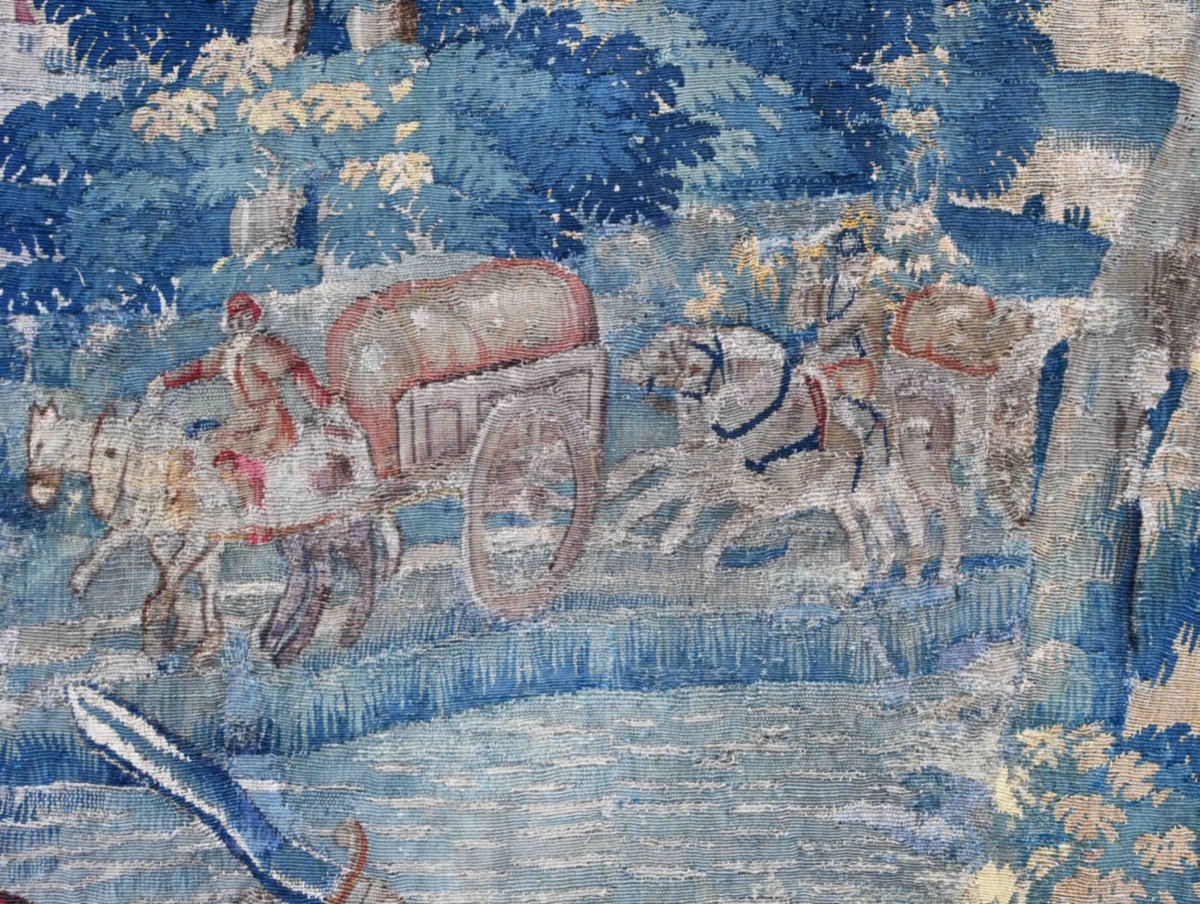 Verdure : Les arbres aux feuillages denses et les motifs floraux au bas de la pièce (mille-fleurs tardif) témoignent du savoir-faire bruxellois dans le rendu des textures organiques.