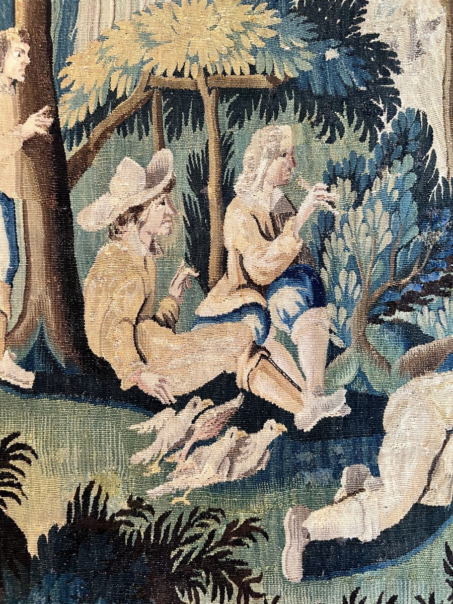 Cette tapisserie de la Manufacture d’Aubusson, réalisée au XVIII?esiècle, illustre avec finesse une scène pastorale intitulée « Capture d’Oiseaux ». Œuvre emblématique du savoir-faire des ateliers d’Aubusson, elle se distingue par la richesse de sa composition et la délicatesse de son tissage.