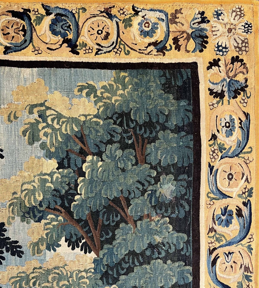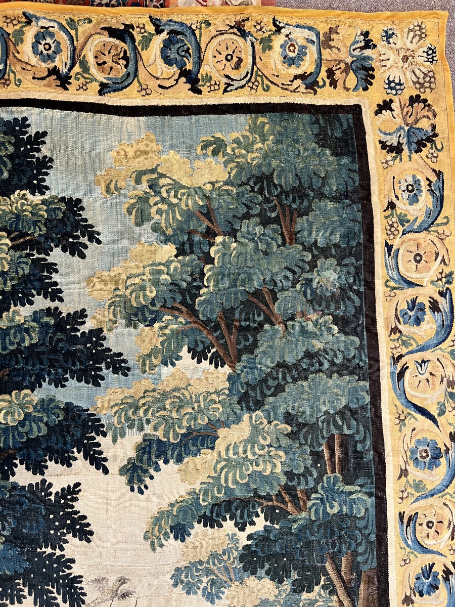 La tapisserie est encadrée d’une large bordure ornementale richement décorée de motifs floraux et végétaux stylisés, alternant entre rinceaux, fleurs et médaillons, traités dans des tons harmonieux qui complètent la scène principale.