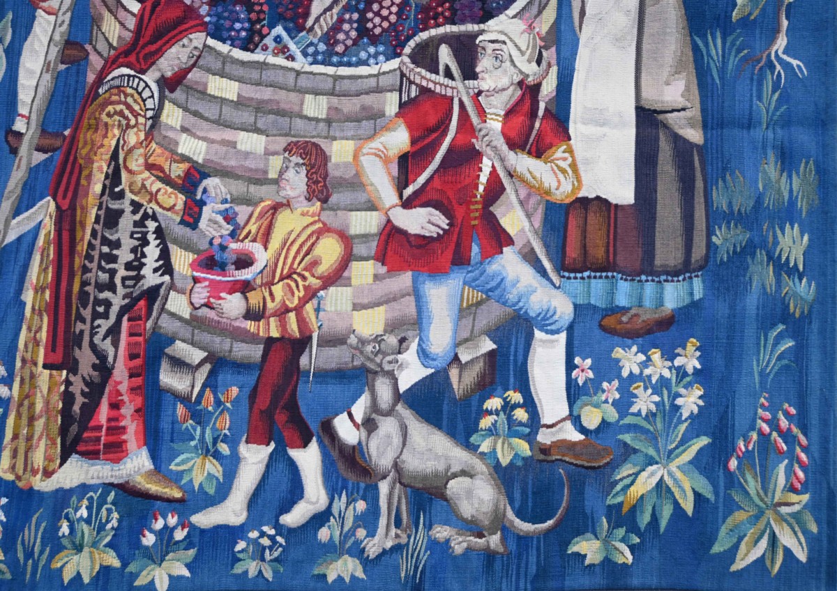 TRES RARE !!! Superbe tapisserie d’Aubusson du XIX? siècle représentant une scène animée de vendanges, richement composée et d’une grande vivacité narrative. La scène centrale met en lumière le travail collectif autour du pressoir, où hommes, femmes et enfant participent à la récolte du raisin, symbole d’abondance et de tradition rurale.