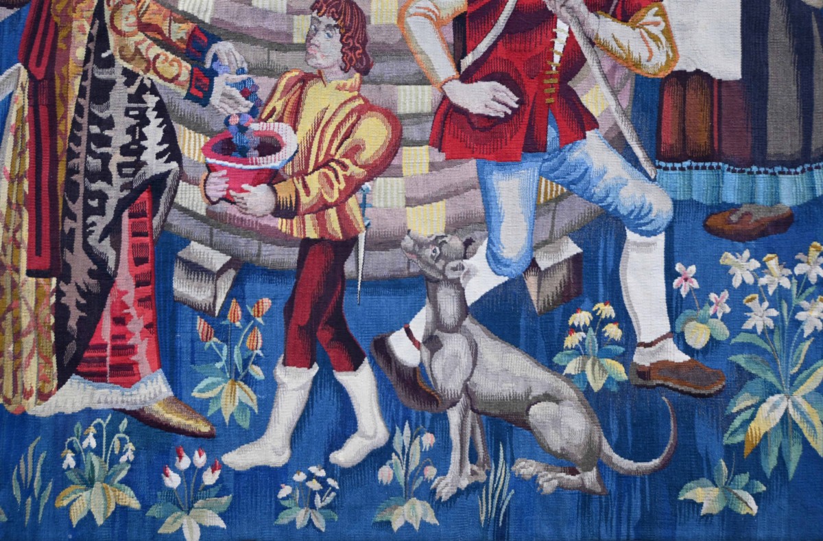 La composition se distingue par la finesse du dessin, la qualité du tissage et une palette chromatique éclatante dominée par un bleu profond, typique des productions d’Aubusson. Les personnages, aux costumes détaillés et aux attitudes expressives, témoignent d’un remarquable sens du mouvement et de la scène de genre. Le décor floral abondant et le traitement délicat des visages renforcent le charme et ...