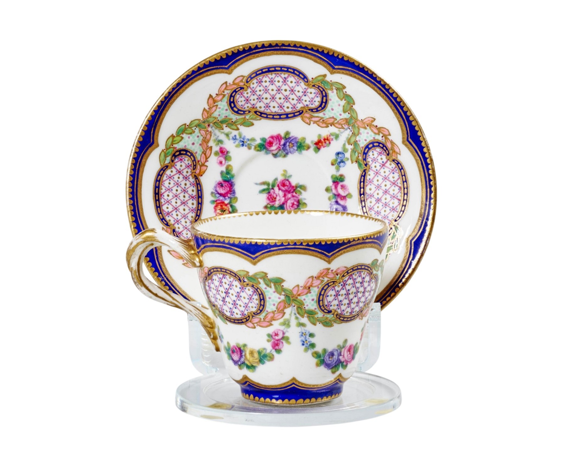 Tasse et sa sous-tasse en porcelaine tendre de Sèvres à décor polychrome et or de fleurs en guirlandes et de cartouches stylisés, anse constituée de deux tiges entrelacées hachurées d'or, lèvres dorées avec galon bleu.