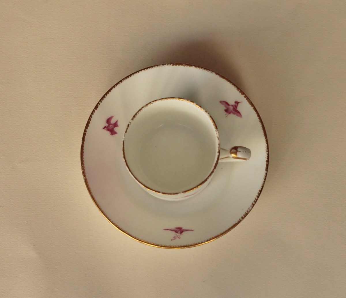 Tasse de forme litron et sa sous-tasse de la 1ere grandeur en porcelaine de Vincennes-Sèvres à décor en camaïeu rose d'angelots et oiseaux. Dents de loup or sur les bords.