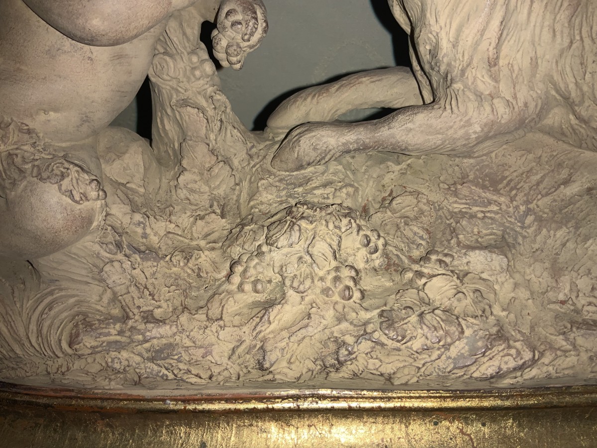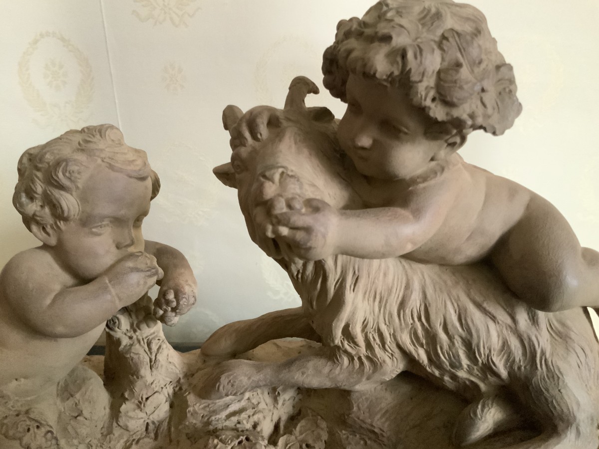 Groupe en terre cuite représentant Bacchus enfant chevauchant un bouc accompagné d’un putti et mangeant des grappes de raisin.
