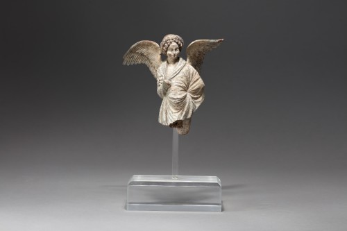 Magnifique figure d’Éros, représenté sous les traits d’un adolescent ailé. Il est vêtu d’un himation, retenu de la main droite qu’il recouvre, et du point gauche posé sur la hanche. Il porte une couronne végétale et sa tête est légèrement tournée vers la gauche. Son bras droit retient un bouquet de fleurs. Un grand soin a été apporté au modelage de cette figure, qu’il s’agisse de l’élégance du drapé, de la reprise à l’outil des mèches de cheveux, ou encore de la beauté du dessin des ailes.