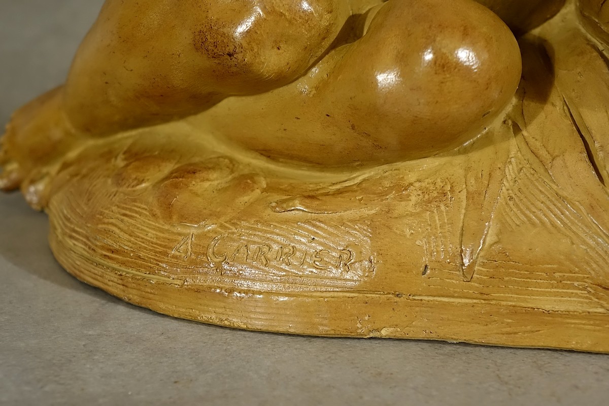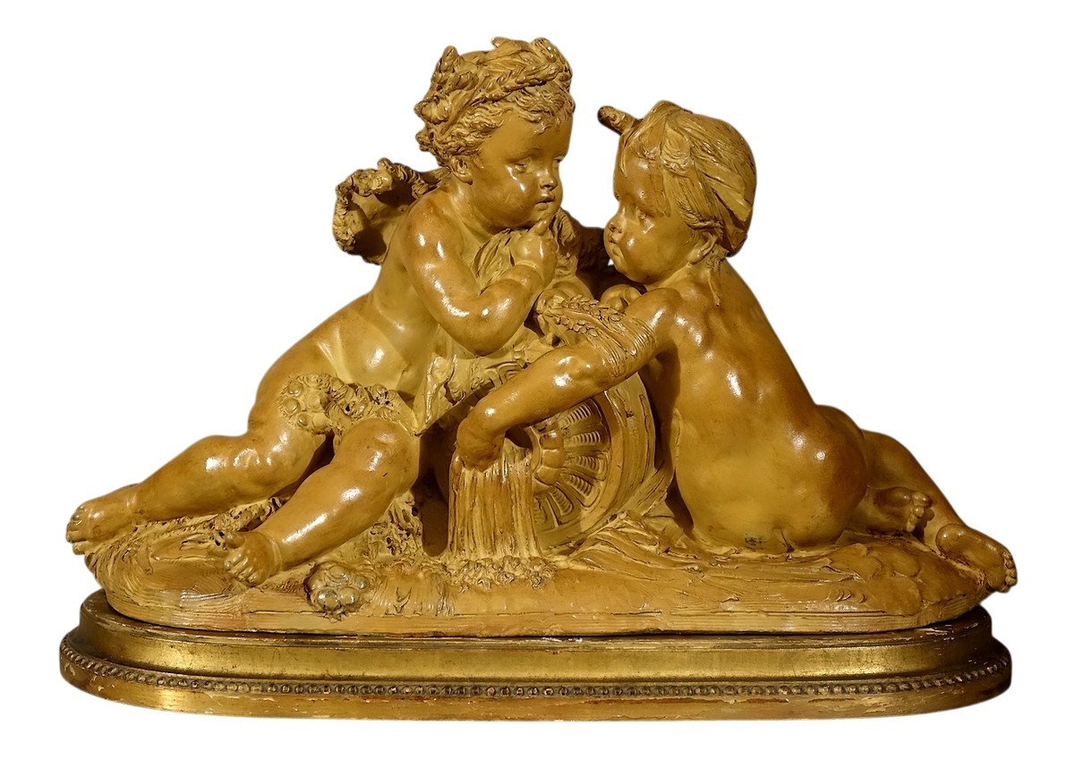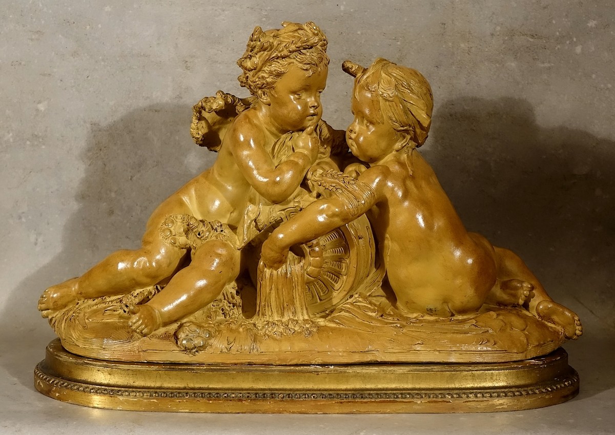 Importante sculpture en terre cuite représentant deux putti accoudés à une fontaine en urne antique sur une terrasse herbue signée A. Carrier pour Albert-Ernest Carrier de Belleuse dit Carrier-Belleuse.