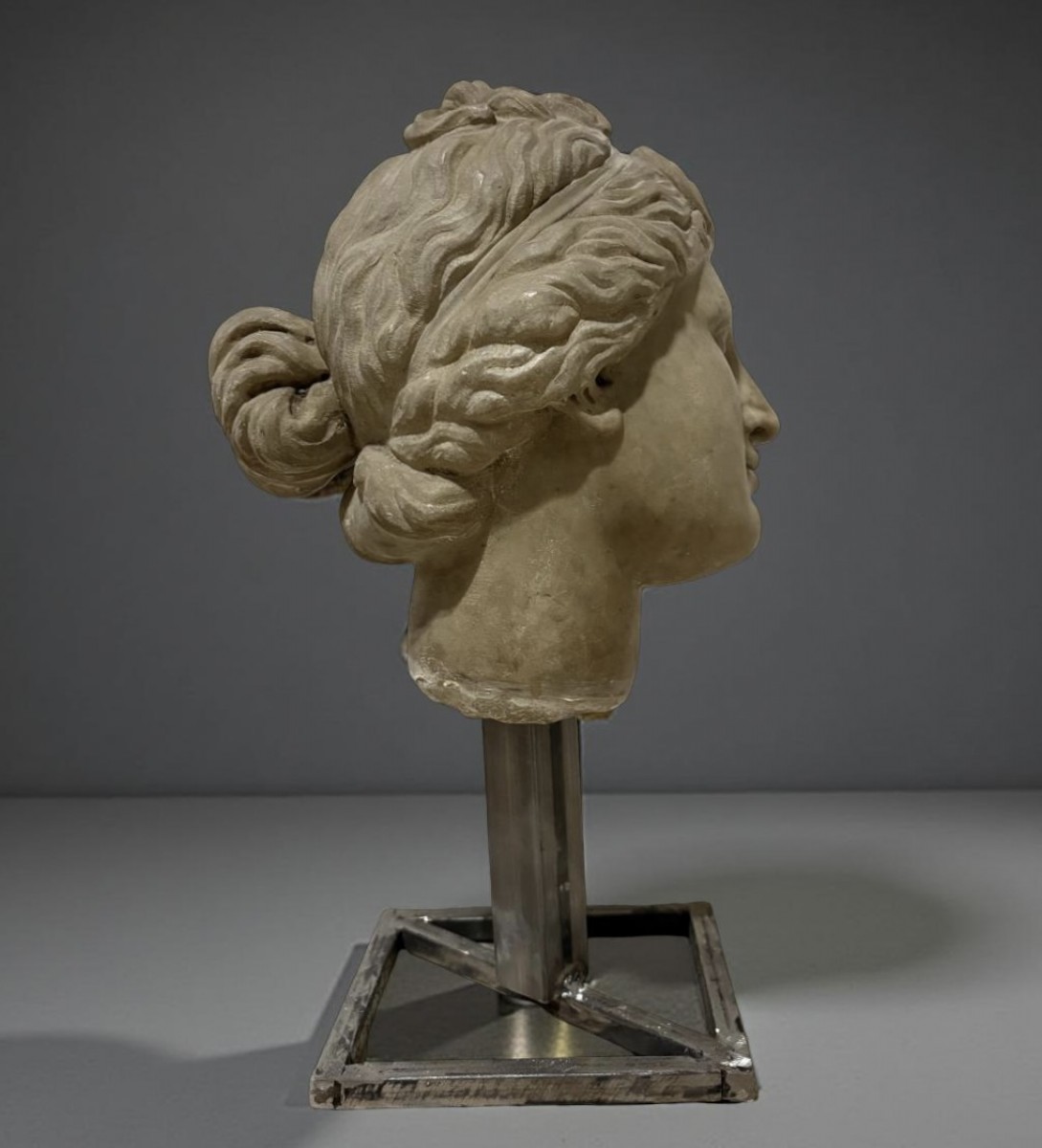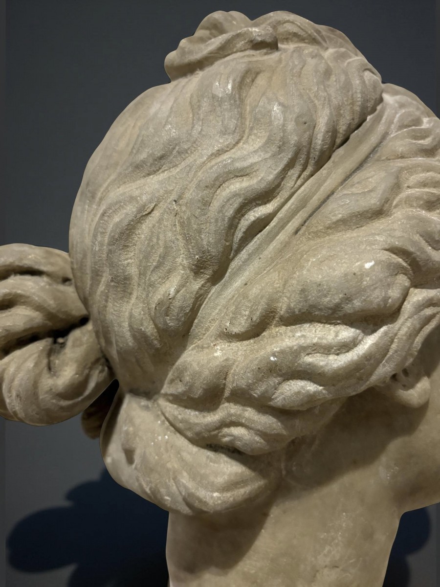 ... en particulier, est d'une finesse exquise, comme en témoignent la délicatesse de la forme des lobes d'oreilles, la minutie de la coiffure, les proportions parfaites du nez et les lèvres légèrement entrouvertes, où les marques des outils percés à la main sont clairement visibles. Ces détails, ainsi que sa patine d'origine intacte, la situent entre la fin du XVIIe et le début du XVIIIe siècle, parmi les premières répliques. La tête, d'une hauteur de 27 cm et légèrement inférieure à la taille réelle, devrait correspondre à celle de la statue originale, dont les dimensions exactes sont inconnues, mais qui mesure 153 cm de hauteur.