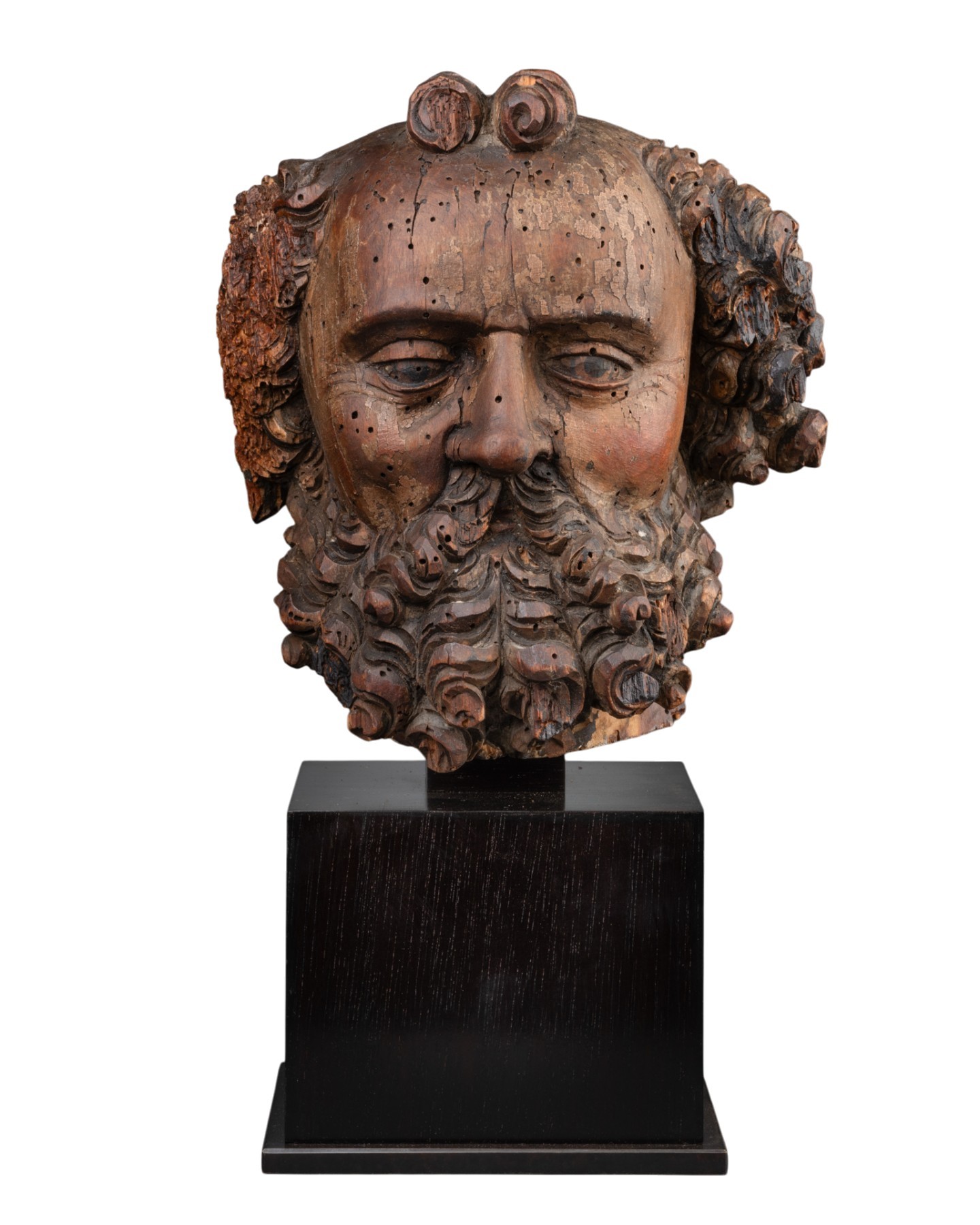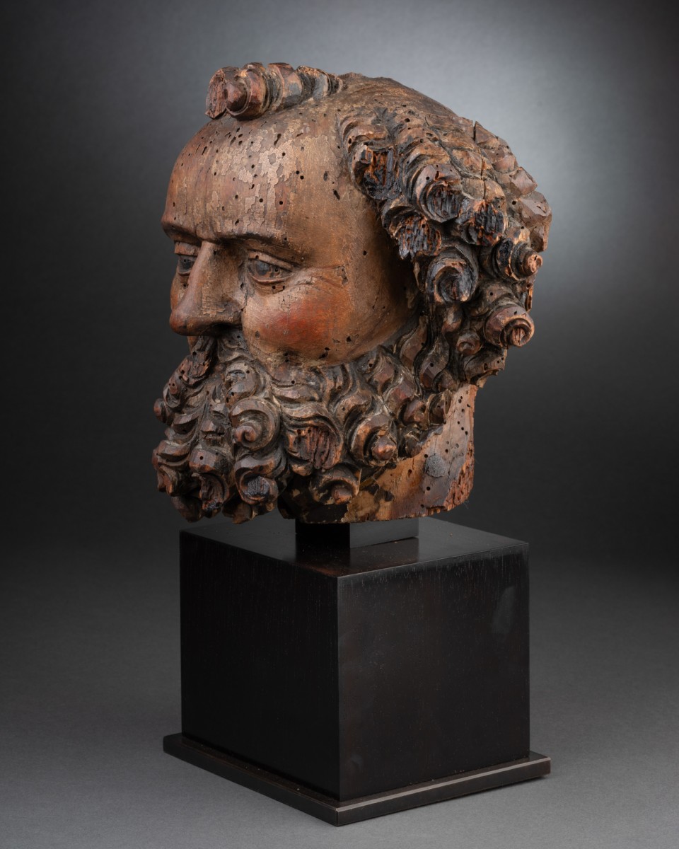 Cette saisissante tête masculine, aux traits puissants et au regard habité, illustre la force expressive de la sculpture religieuse du début du XVIe siècle. Le sculpteur y déploie une virtuosité remarquable dans le traitement du bois : la chevelure et la barbe, profondément fouillées, s’animent de volutes nerveuses qui contrastent avec la douceur intériorisée du visage.