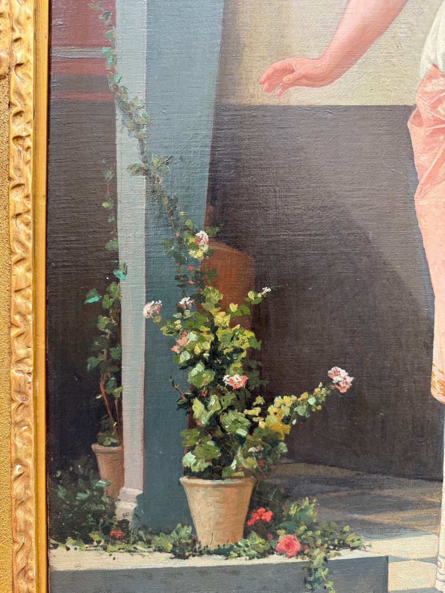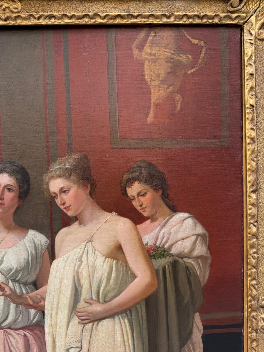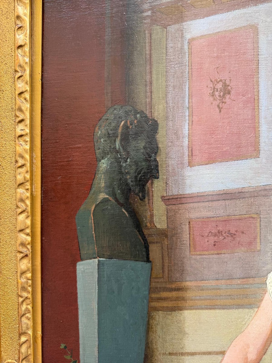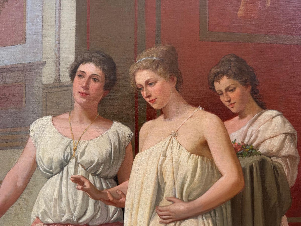 Très belle scène pompéienne représentant 3 jeunes femmes vêtues à l’antique dans un patio admirant une sculpture sur colonne.