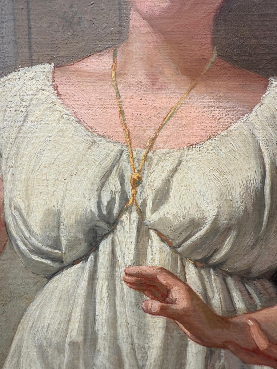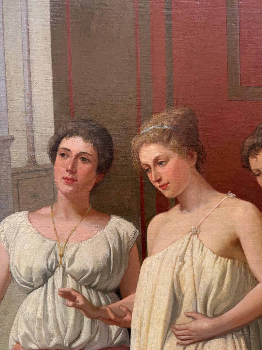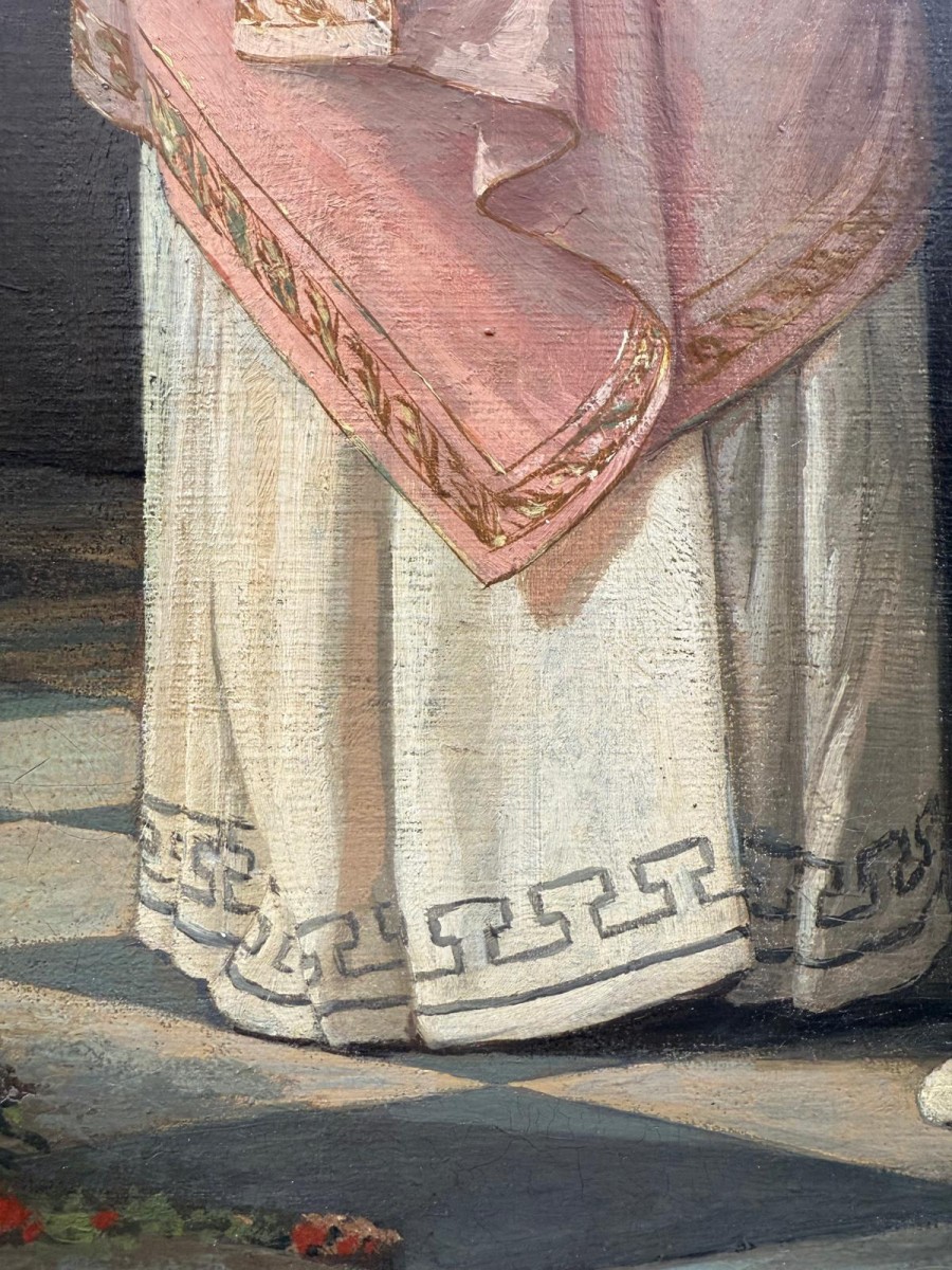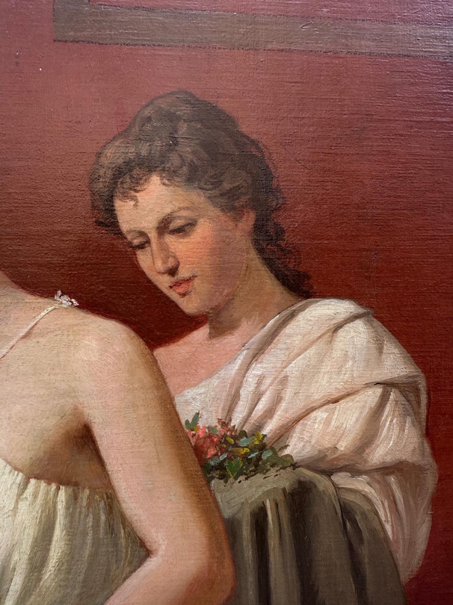 Très belle scène pompéienne représentant 3 jeunes femmes vêtues à l’antique dans un patio admirant une sculpture sur colonne.