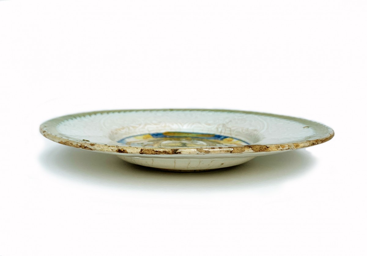 La petite assiette o tondino présente un bord légèrement incurvé, une paroi en pente douce, un rebord arrondi et un petit anneau en relief en guise de pied. La décoration montre, autour du bord, une guirlande de petites feuilles lancéolées dessinées en brun, tandis que l’aile est richement décorée avec la technique du bianco sopra bianco (blanc sur blanc) qui prévoit une dense décoration de spirales feuillues, tracée en blanc d'étain directement sur l'émail. Au centre, dans un paysage vallonné avec le ciel au coucher du soleil, se distingue un écu encadré avec l'emblème nobiliaire bipartite de la famille Mazza di Pesaro, surmonté de la lettre "M" et flanqué des initiales "G" et "P".