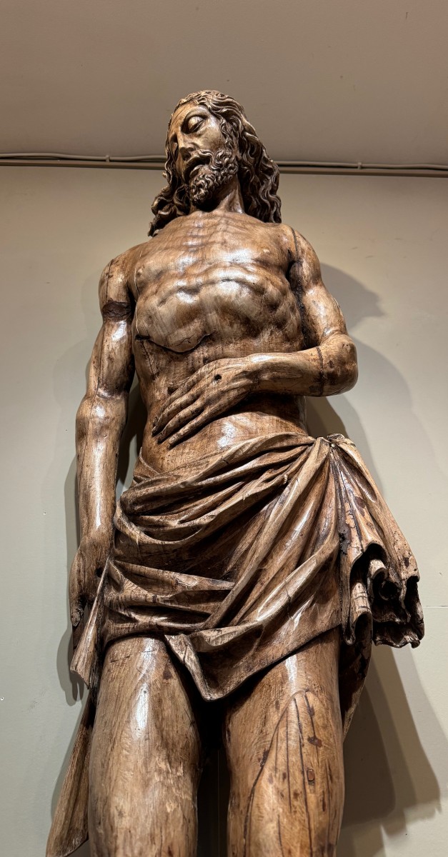 Anciennement peint, traces de préparation surtout sur le très beau périzonium ; un doigt de la main droite restauré.