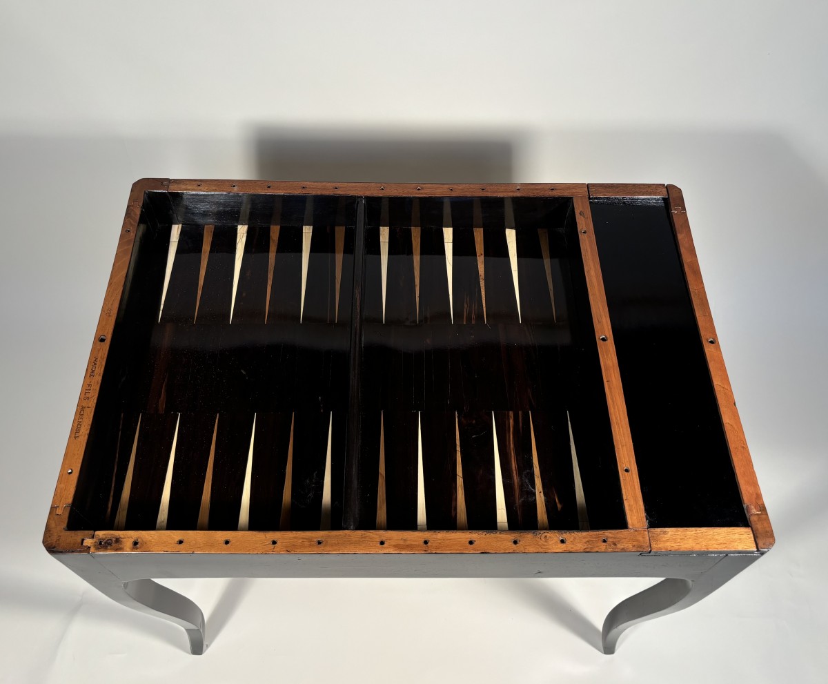 L’intérieur découvre un jeu de tric-trac en placage d’ébène, ivoire et buis et un compartiment à jetons à glissière coulissante dans les deux sens.