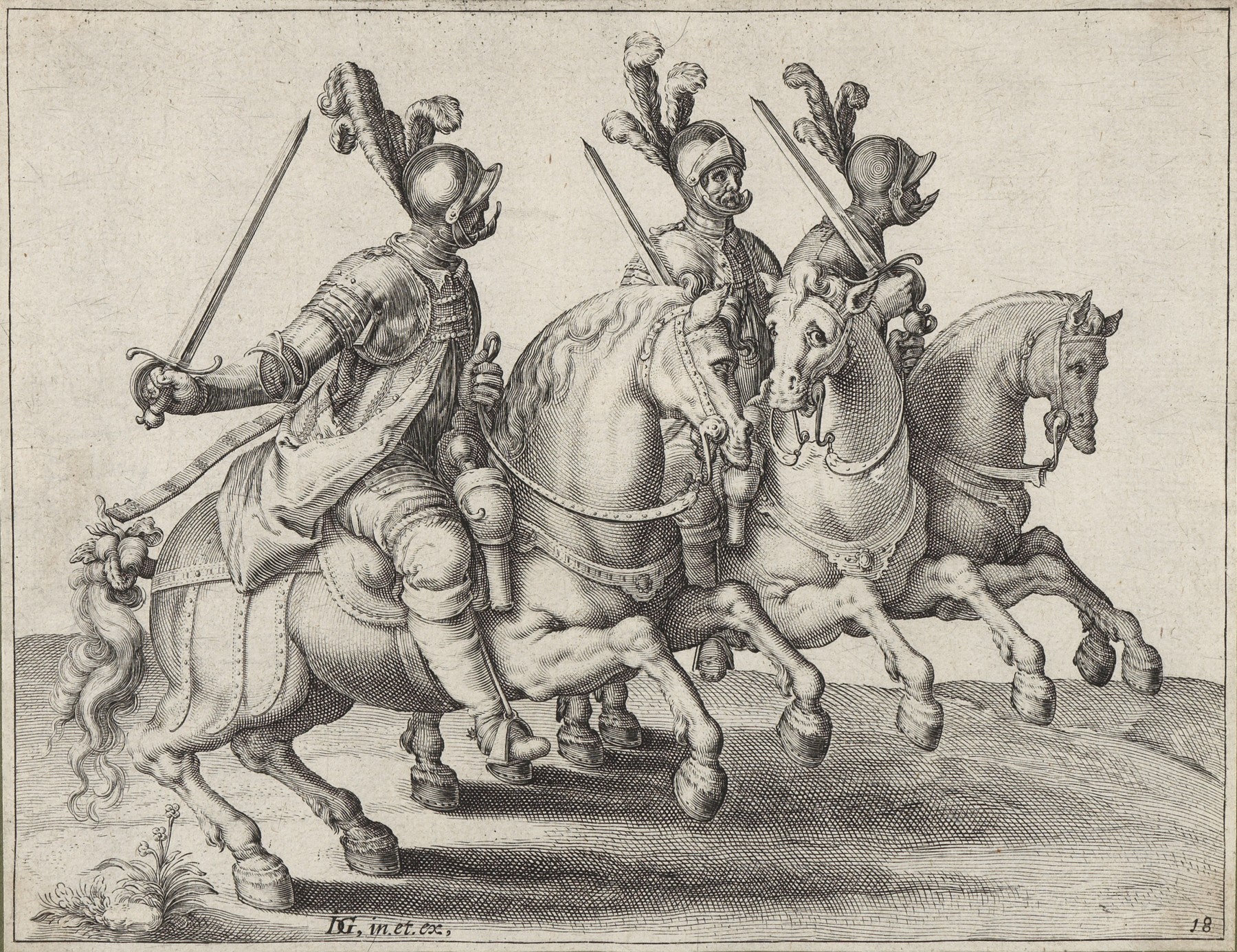Cette estampe, numérotée «?18?», clôt la suite des dix-huit Cavaliers gravée par Jacob de Gheyn II à la fin du XVI? siècle. L’ensemble appartient à la période où l’artiste assimile les modèles italiens tout en développant un langage graphique très personnel, nourri de l’héritage maniériste et de la précision propre aux ateliers néerlandais. La scène montre trois cavaliers en armure, engagés dans une charge vigoureuse. Le mouvement accentué des chevaux, les torsions des silhouettes et le raffinement des armures témoignent de l’attention de de Gheyn aux compositions équestres diffusées par Stradanus ou Tempesta, mais aussi de sa capacité à en proposer une interprétation plus analytique et structurée. Le burin, d’une grande finesse, met en valeur les jeux de lumière sur le métal et la tension dramatique de la scène.