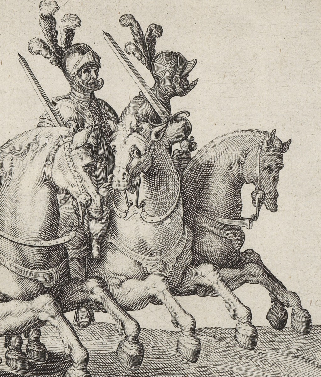 La suite des Cavaliers occupe une place importante dans l’évolution de l’artiste : elle annonce ses séries militaires ultérieures et les illustrations du Wapenhandelinghe, tout en montrant l’ambition graphique d’un graveur qui, dès les années 1590, s’impose comme l’une des figures majeures du maniérisme nordique. Un exemplaire complet de ses 22 planches dont les 18 Cavaliers a été vendu 46 000 € en Hollande.