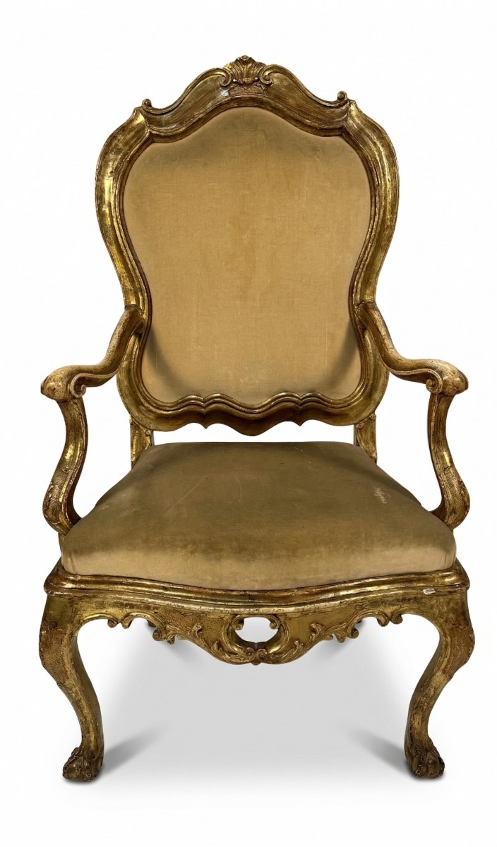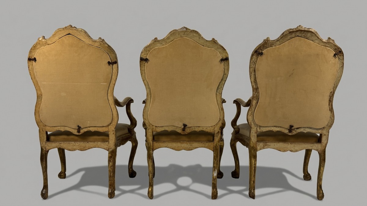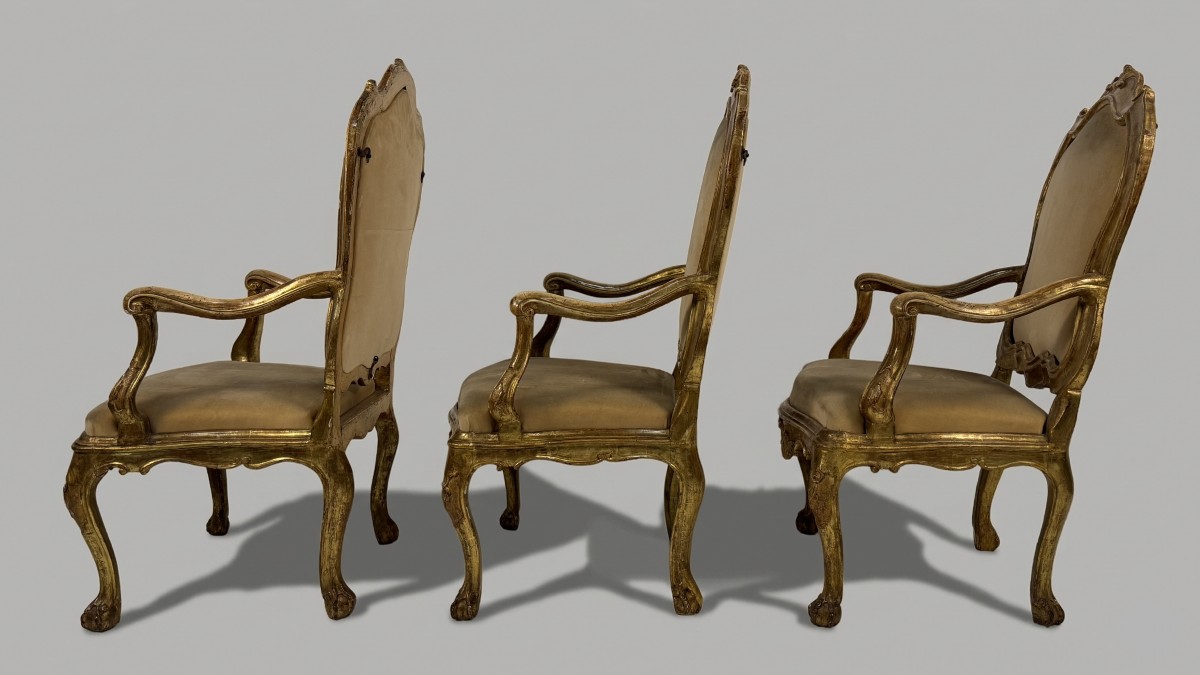 Retrouver le mobilier ou les objets d''art similaires à « Trois fauteuils en bois doré, Venise XVIIIe siècle » présenté par Antichità Giglio, antiquaire à Milano dans la catégorie Fauteuil & Bergère Louis XV, Sièges.