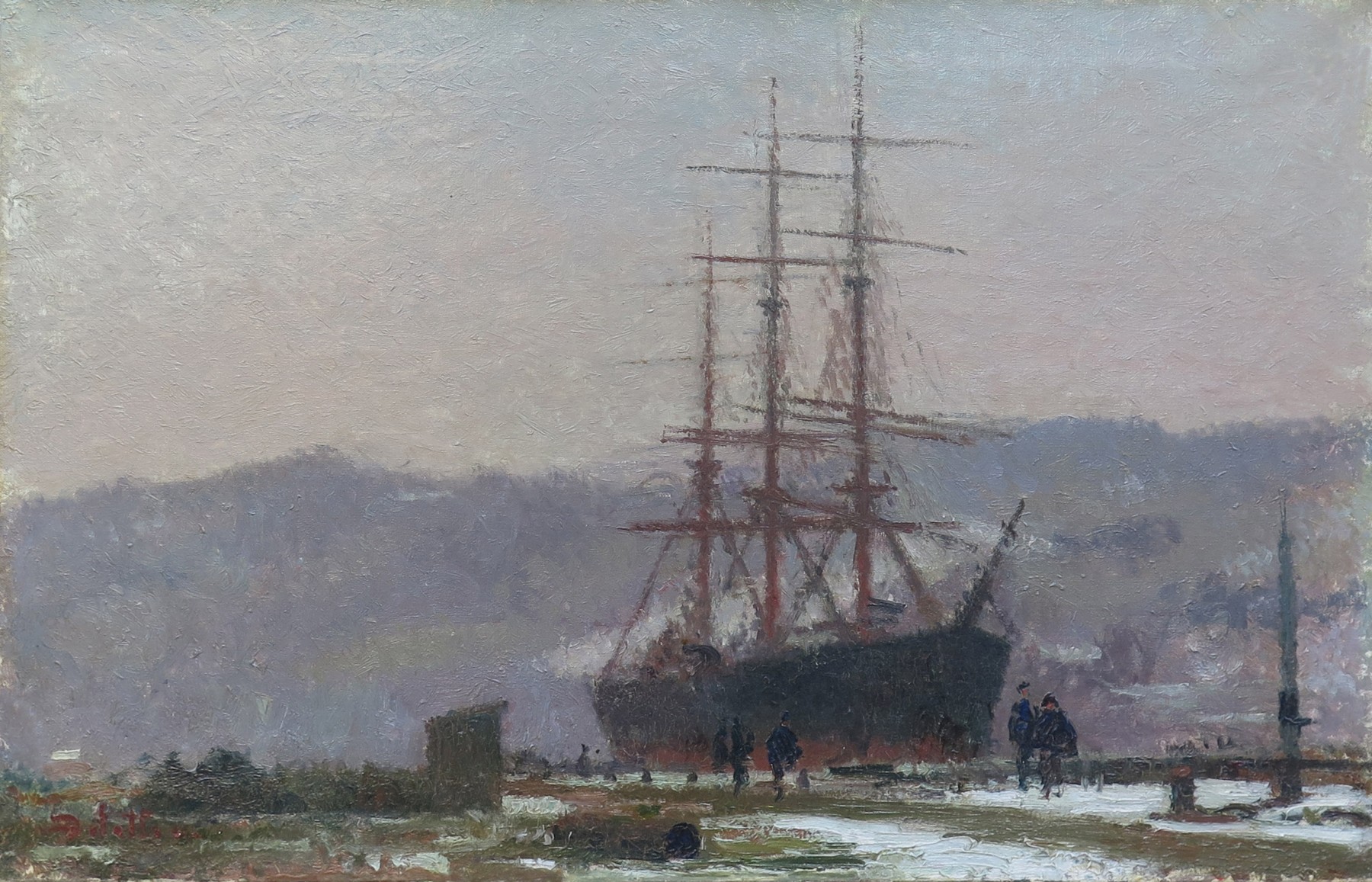 Ce rare portrait de bateau de Joseph Delattre, nous montre un trois mats à quai à Petit-Couronne en aval de Rouen en hiver.