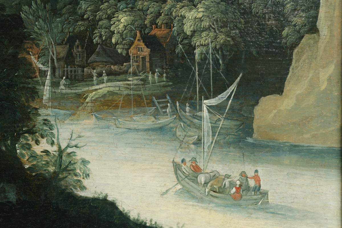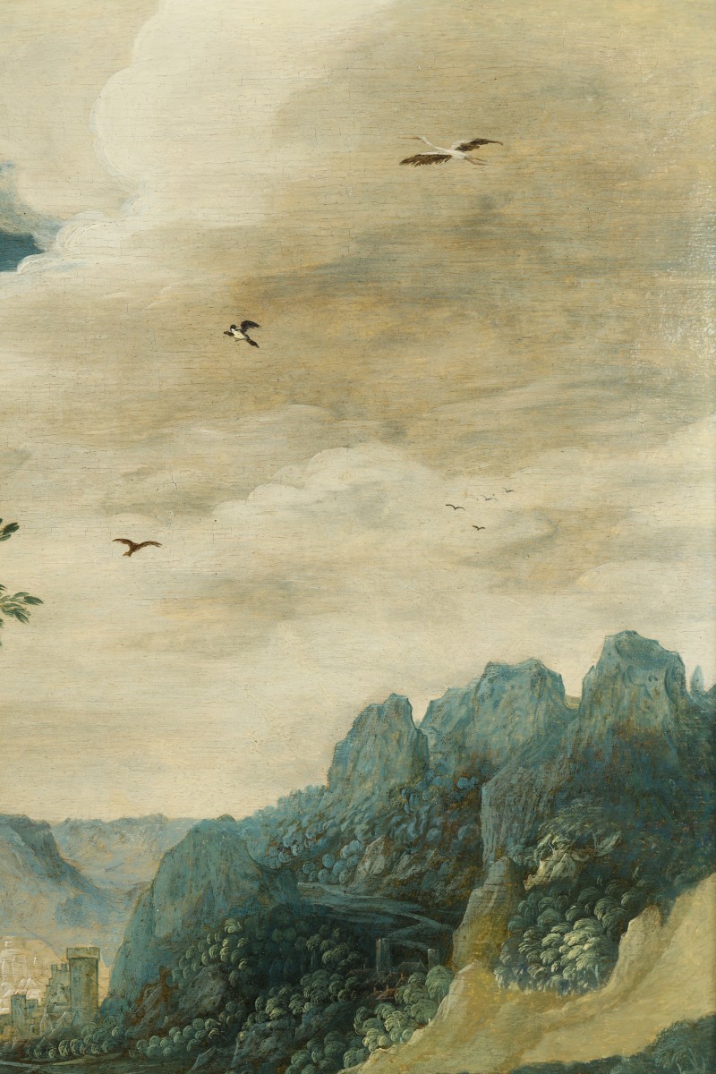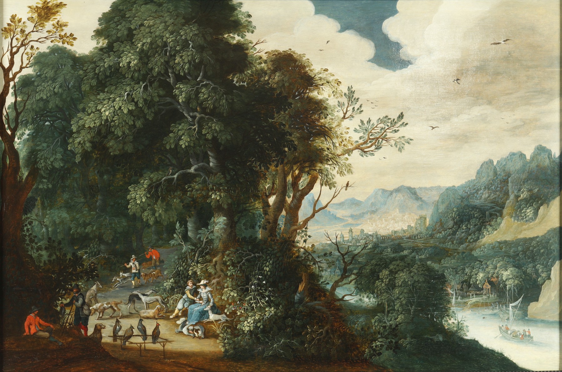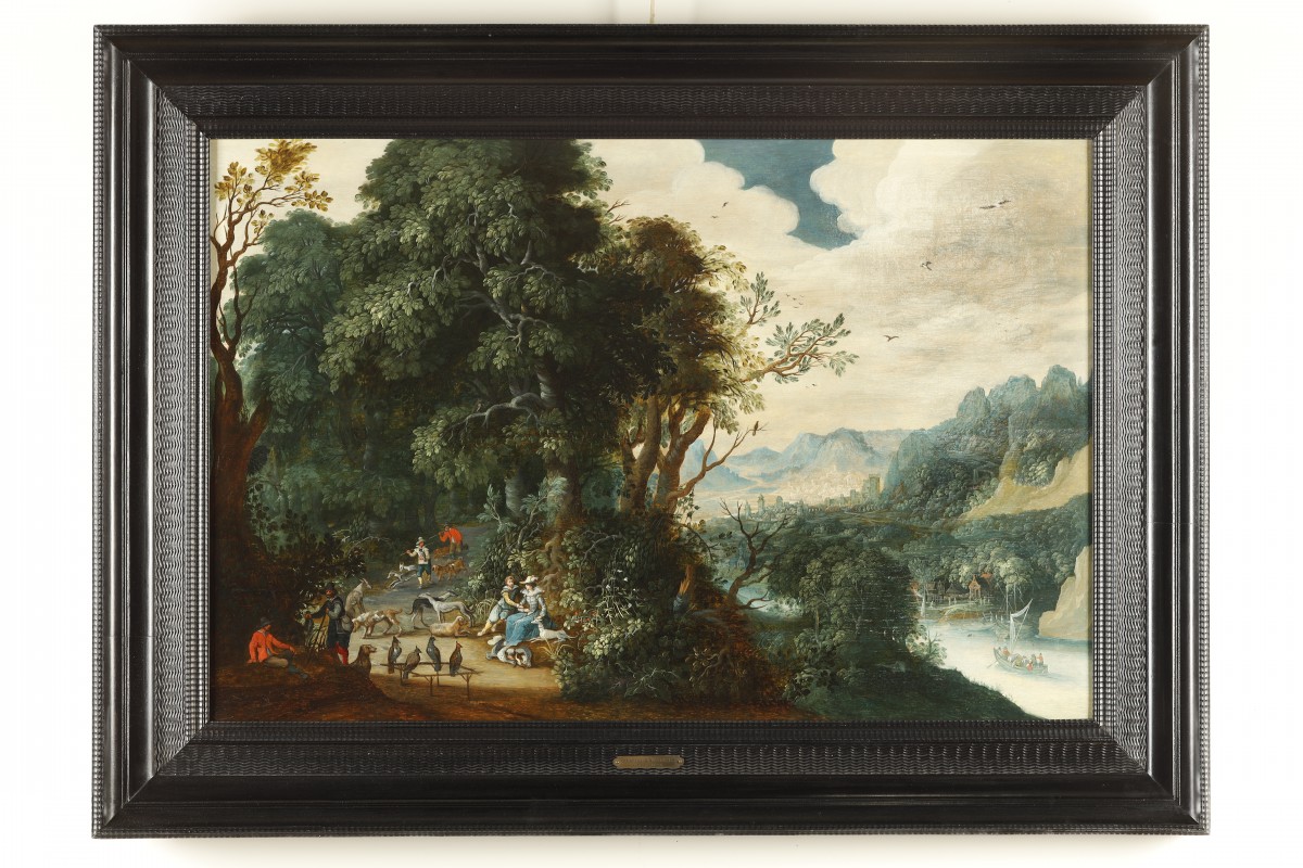 ... d’une lumière douce et dorée. La composition est soigneusement structurée, suivant la tradition tripartite flamande des tons : brun-ocre au premier plan, vert au milieu, et bleu-gris vers l’arrière-plan, créant une impression de profondeur et de calme majestueux.