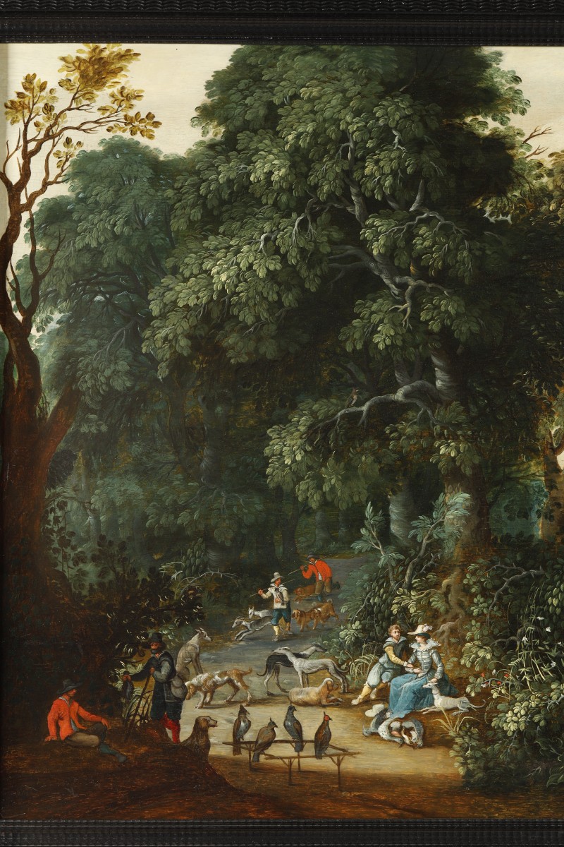 La touche du pinceau est fine, précise, caractéristique de Govaerts, qui affectionnait les compositions animées dans des environnements boisés. Chaque élément — arbres, feuillages, costumes, animaux — est peint avec un sens aigu du détail, typique de l’art flamand du Siècle d’or.