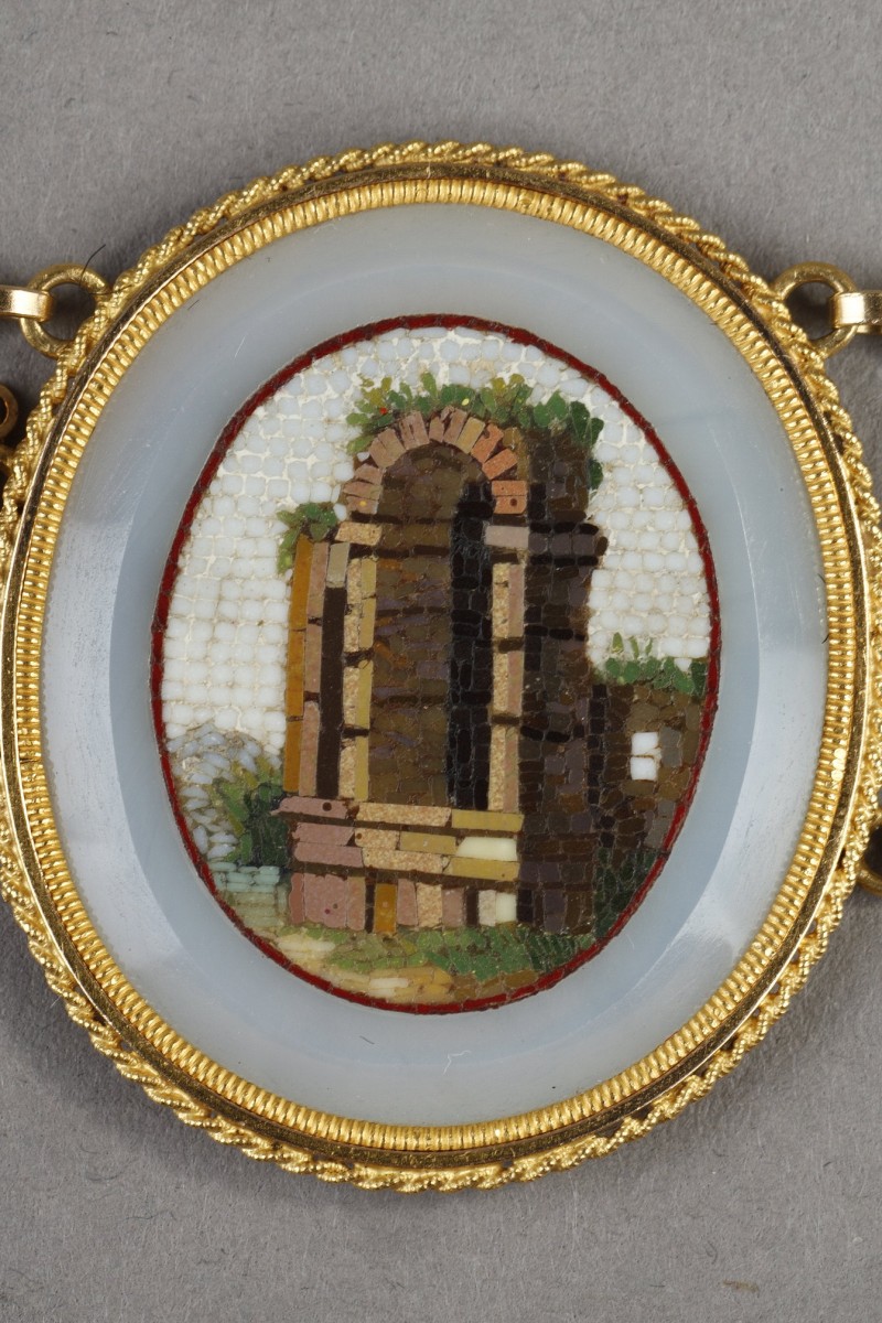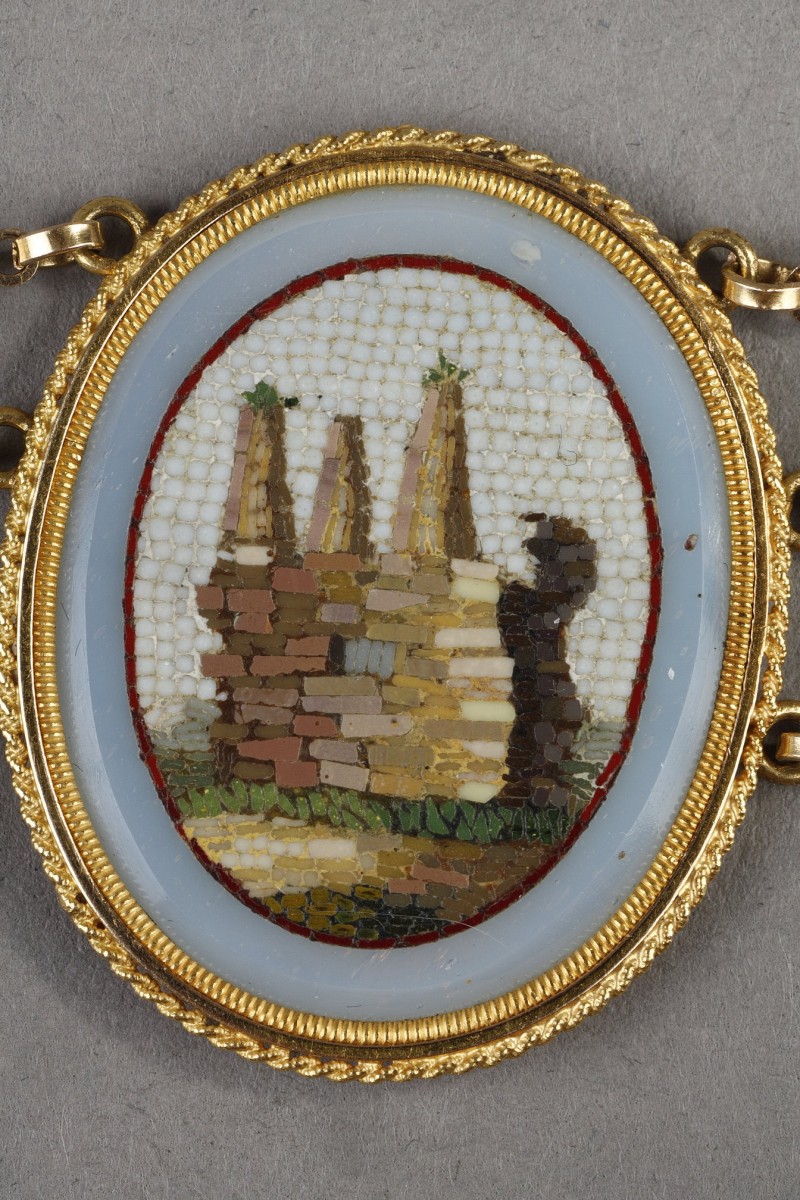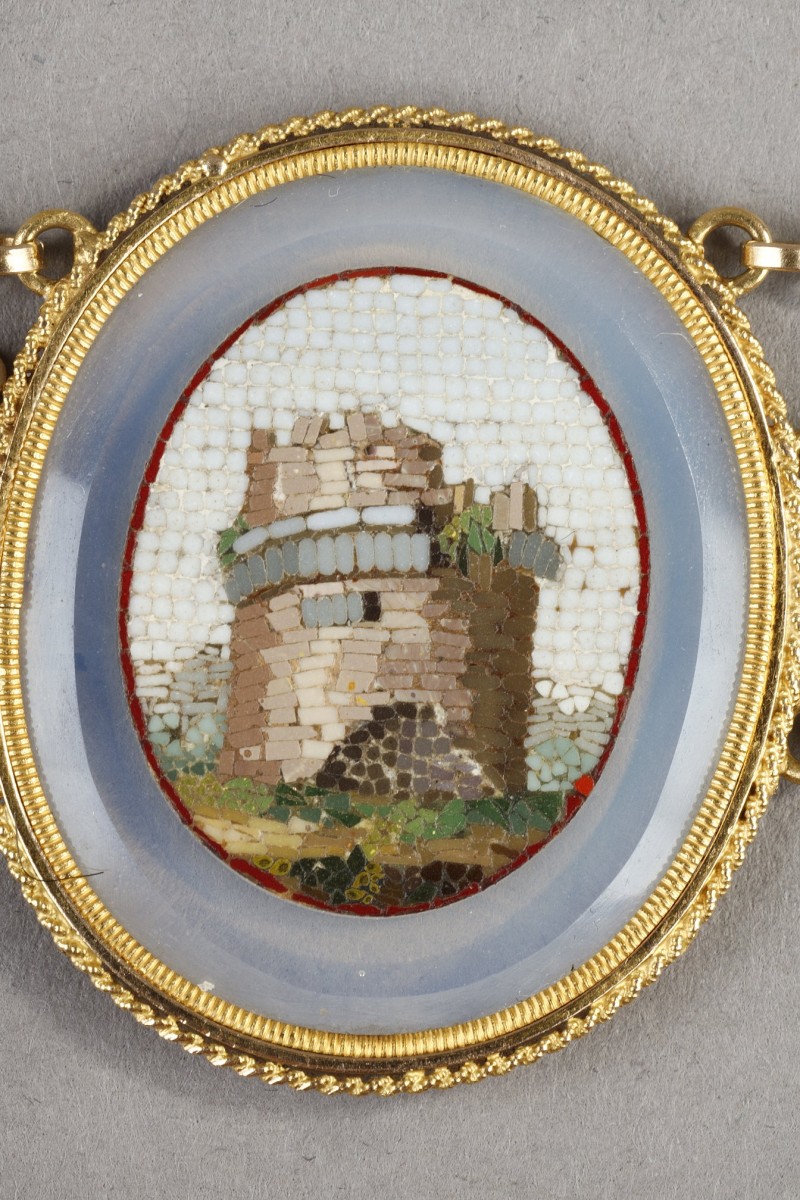 Très beau collier constitué d'une succession de médaillons sertis dans une monture en or et centré d'un motif en micromosaique représentant des ruines de Rome. En verre opalin de couleur bleu-gris d'une rare transparence, ces médaillons sont reliés entre eux par trois chaînettes en or finement ciselées.