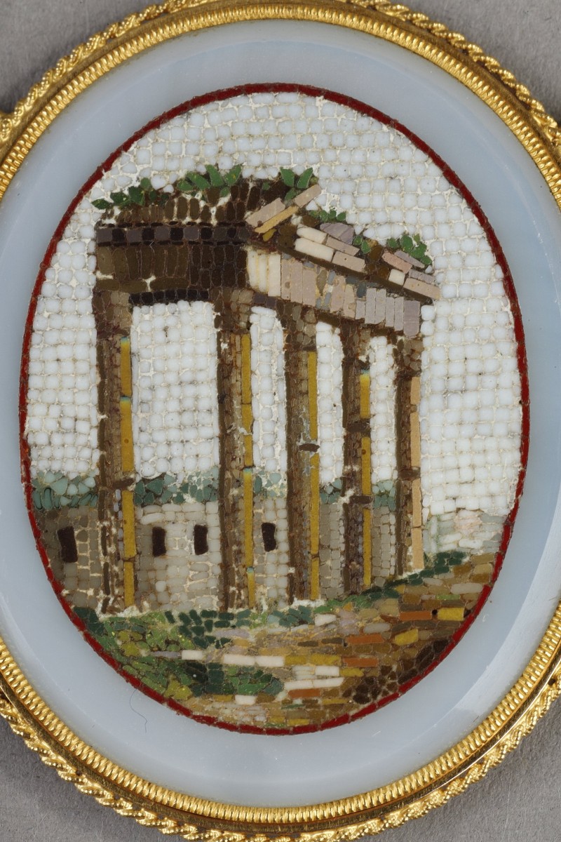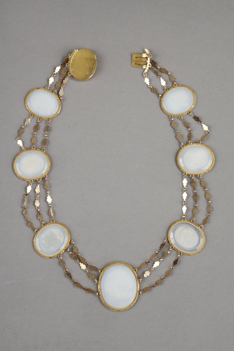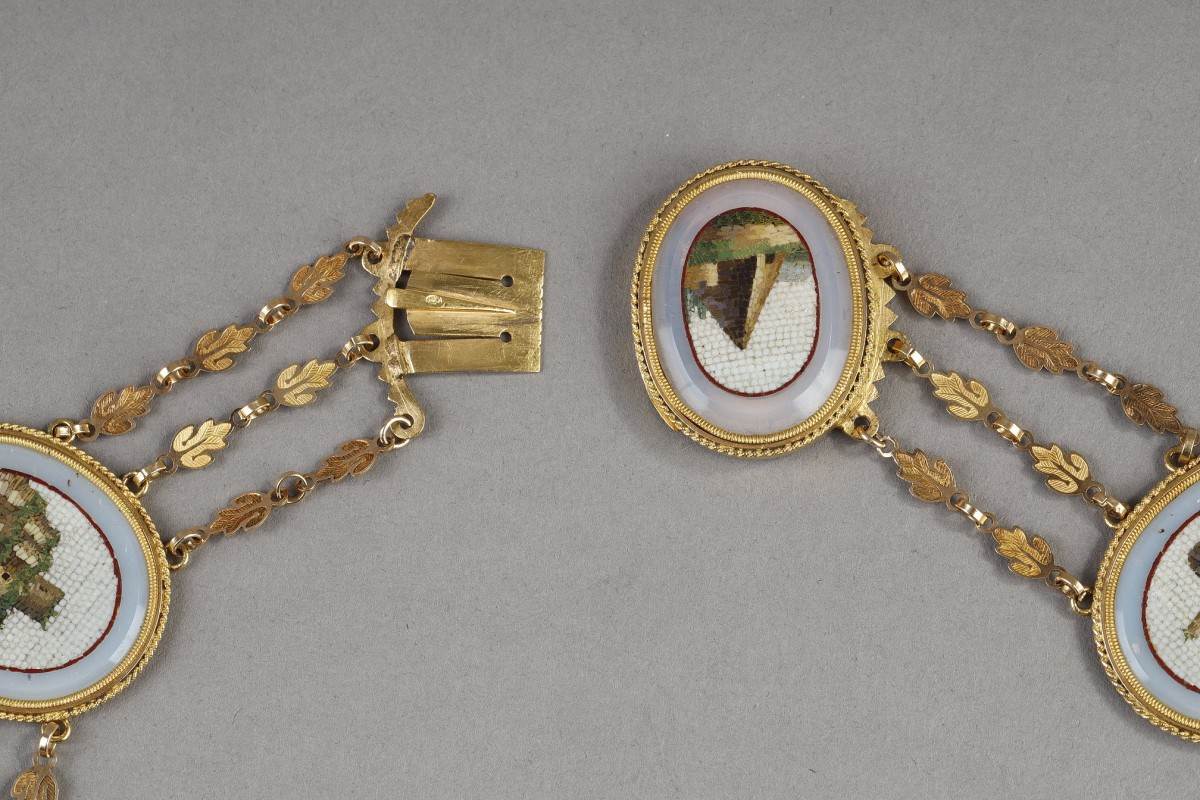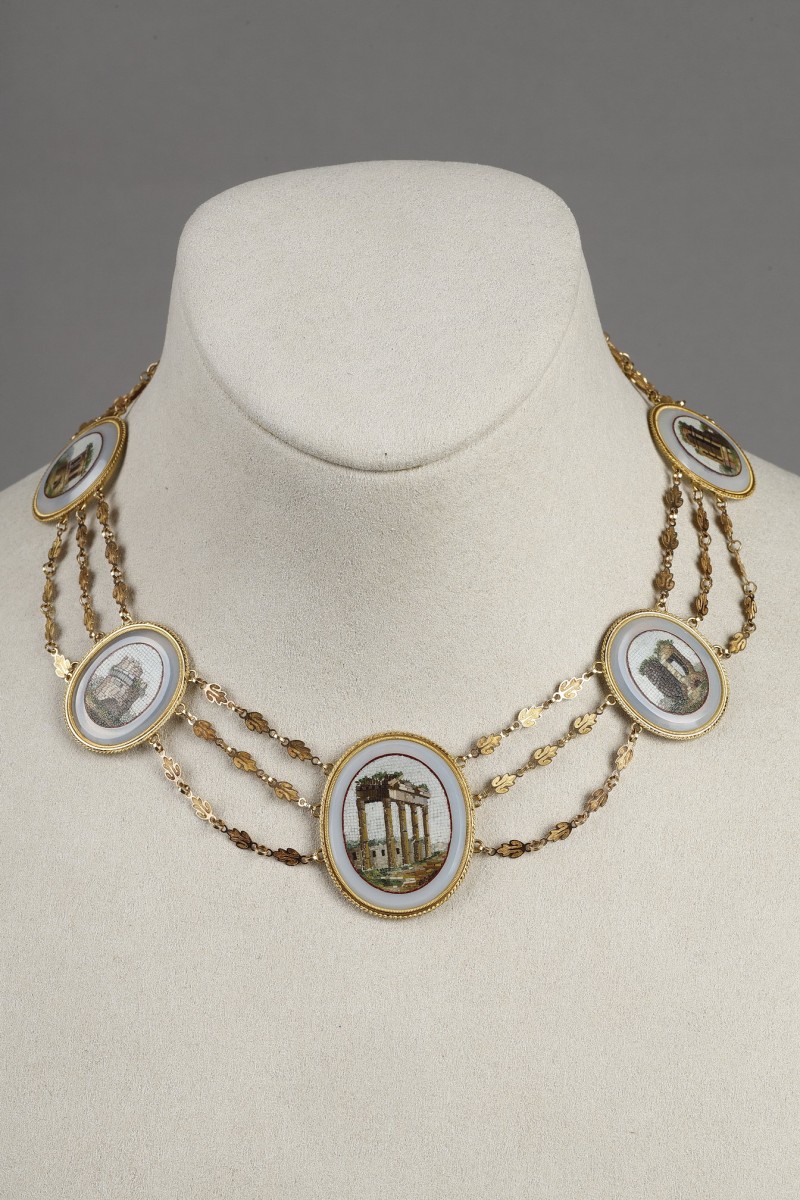 Très beau collier constitué d'une succession de médaillons sertis dans une monture en or et centré d'un motif en micromosaique représentant des ruines de Rome. En verre opalin de couleur bleu-gris d'une rare transparence, ces médaillons sont reliés entre eux par trois chaînettes en or finement ciselées.
