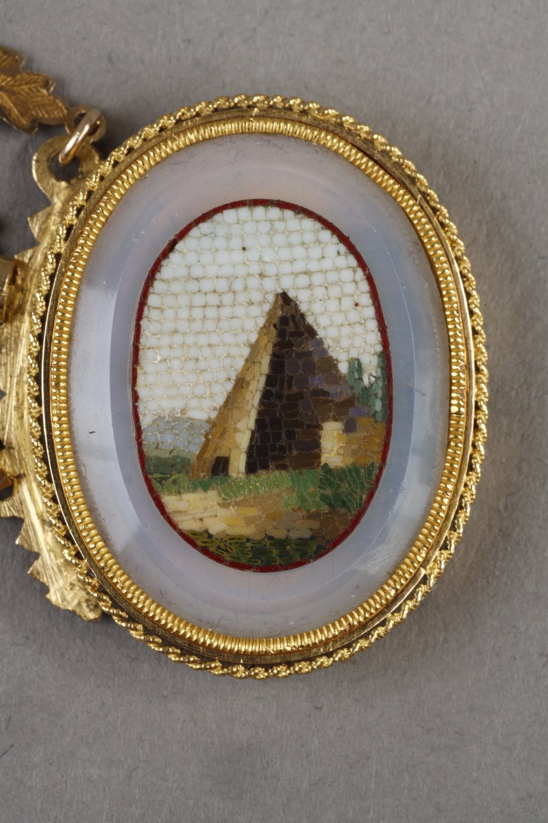 Retrouver le mobilier ou les objets d''art similaires à « Collier en or et micromosaique, début XIXe siècle » présenté par Ouaiss Antiquités, antiquaire à Paris dans la catégorie Pendentif, Collier Empire, Bijouterie, Joaillerie.