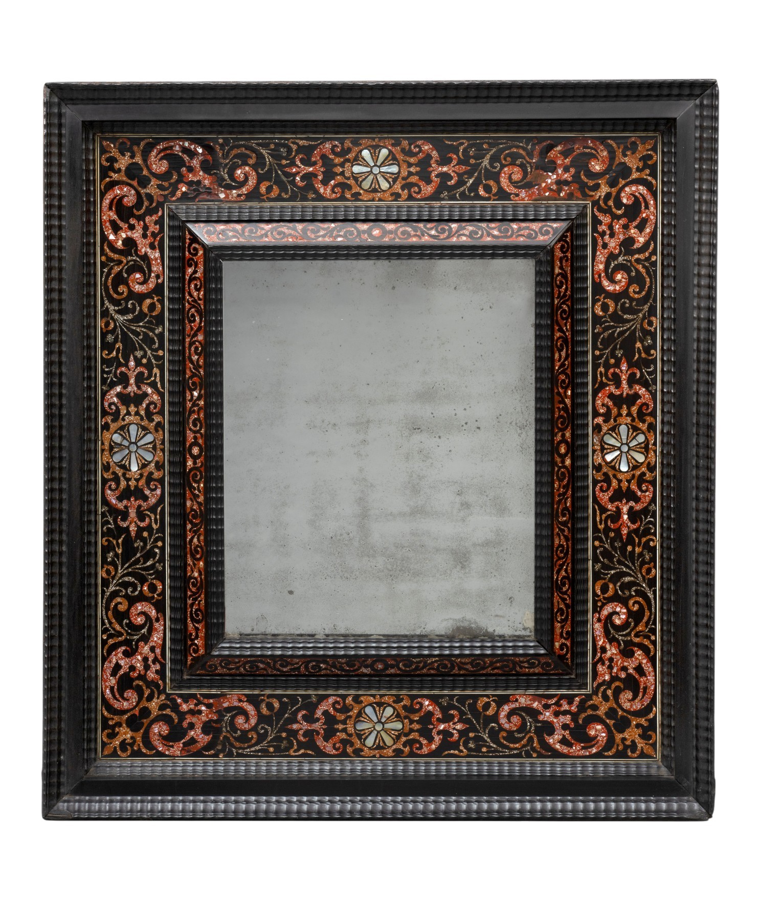 Grand miroir en ébène incrusté de laque, originaire des Pays-Bas méridionaux (Anvers ou Bruxelles).