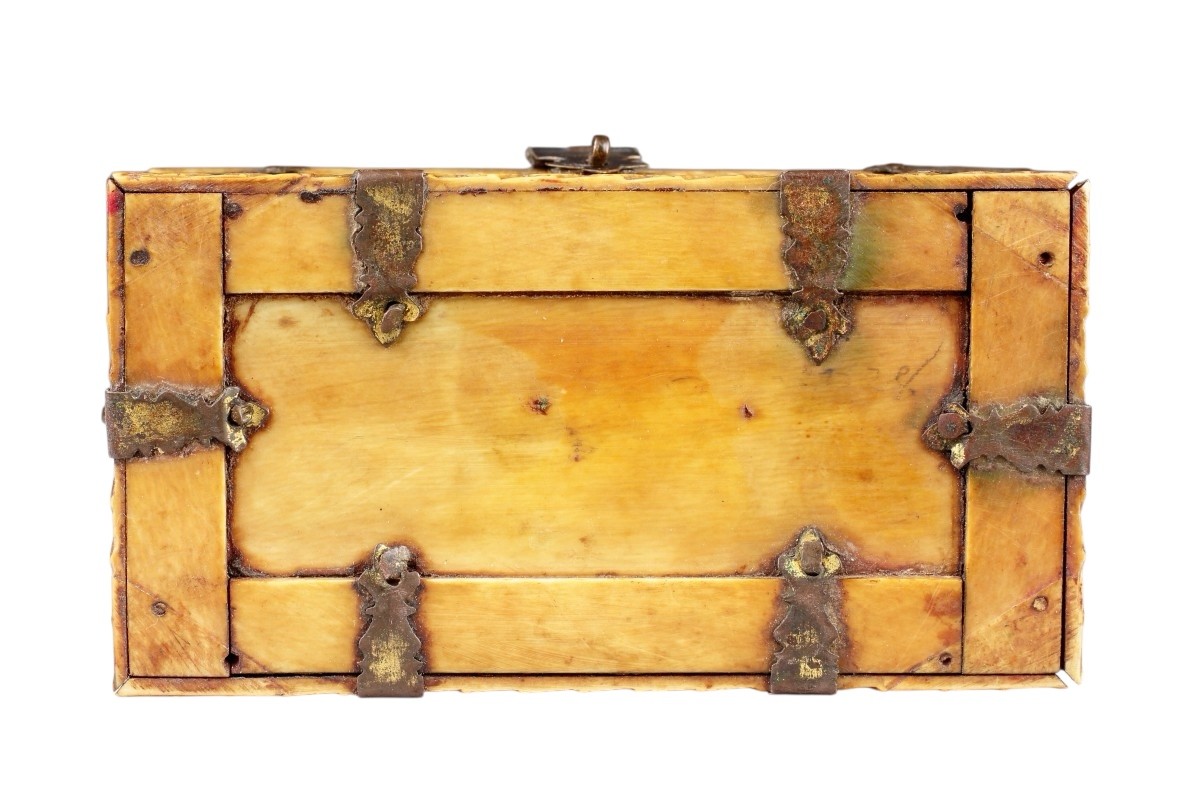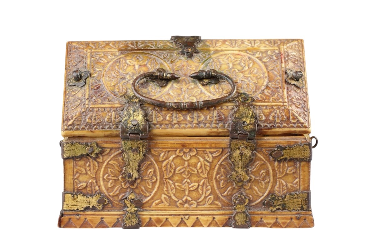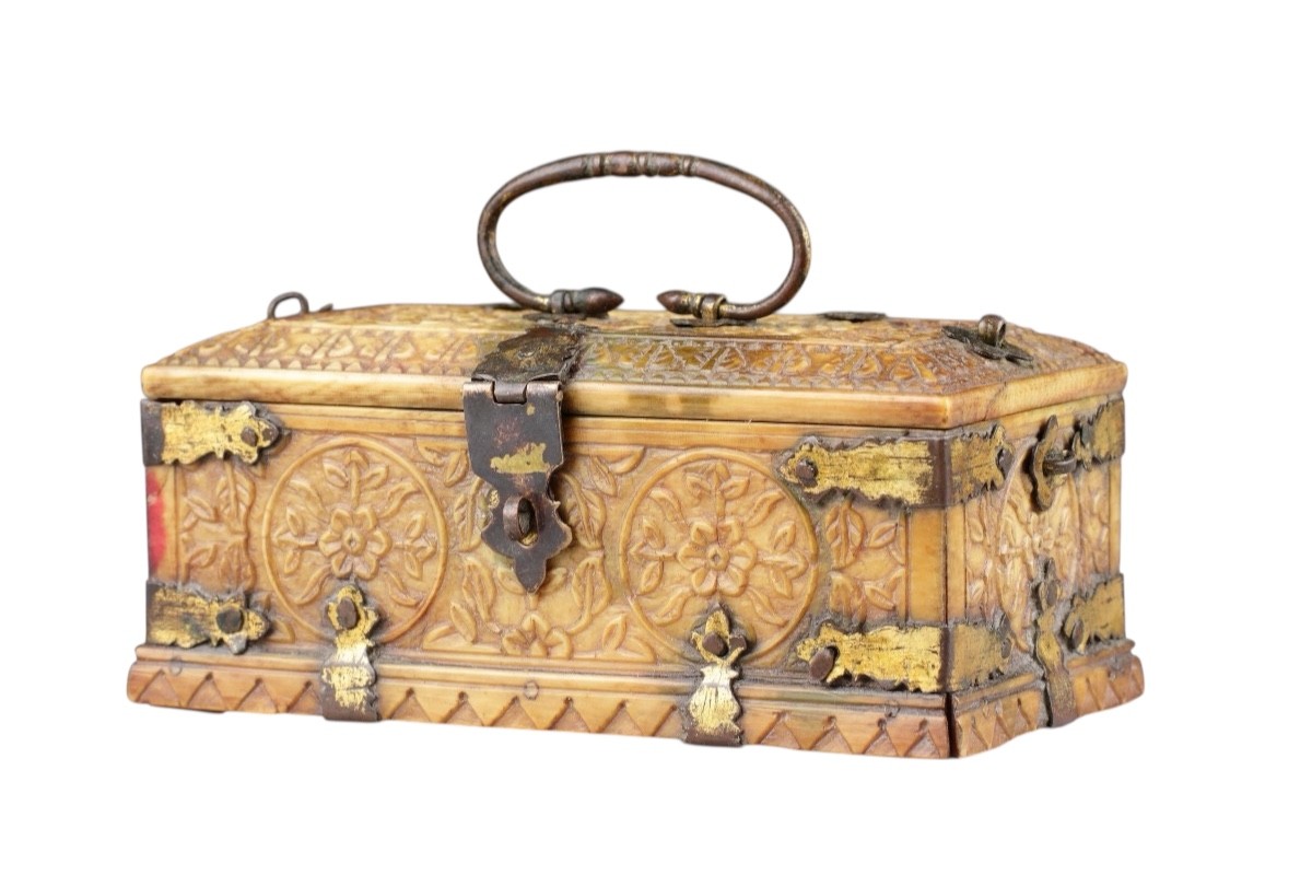 Petit coffret moghol en ivoire sculpté, Inde du Nord, avec montures en métal doré