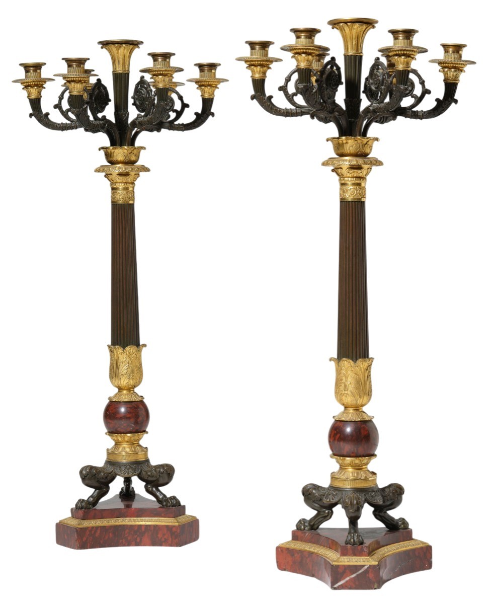 Chaque candélabre s’élève depuis une base triangulaire à côtés concaves en marbre rouge griotte richement veiné, bordée d’une moulure en bronze doré à décor de perles et de bobines. Celle-ci repose sur trois monopodes en bronze patiné, puissamment modelés en forme de pattes de lion, soutenant un nœud orné de feuilles d’acanthe en bronze doré.