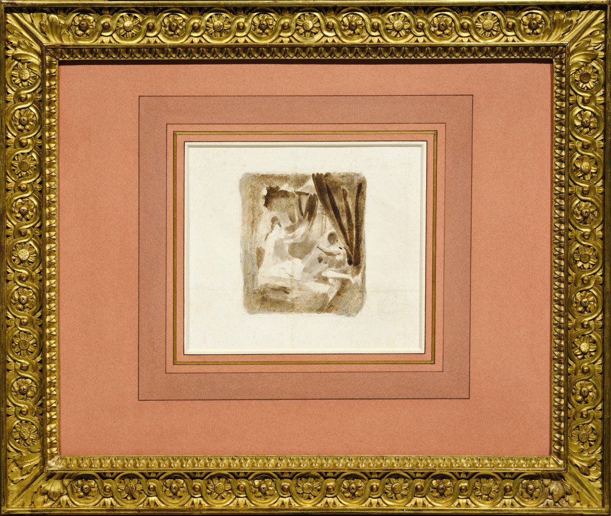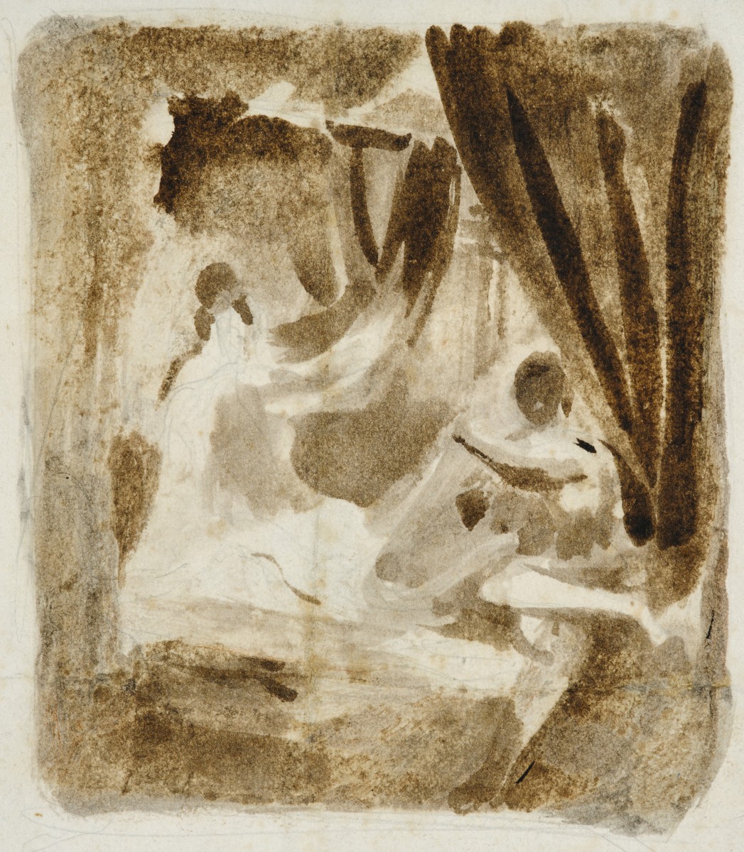 Rapidement exécuté à la pointe du pinceau, ce lavis à la frontière de l’abstraction nous a séduit par sa grande spontanéité. Cette étude est en effet une première pensée pour une petite toile licencieuse peinte par Delacroix dans un goût troubadour à son retour d’Angleterre en 1825 : Le duc d’Orléans montrant sa maîtresse. Delacroix utilise comme support pour cette étude une des toutes premières épreuves de la lithographie « Homme noir à cheval » publiée en 1823.