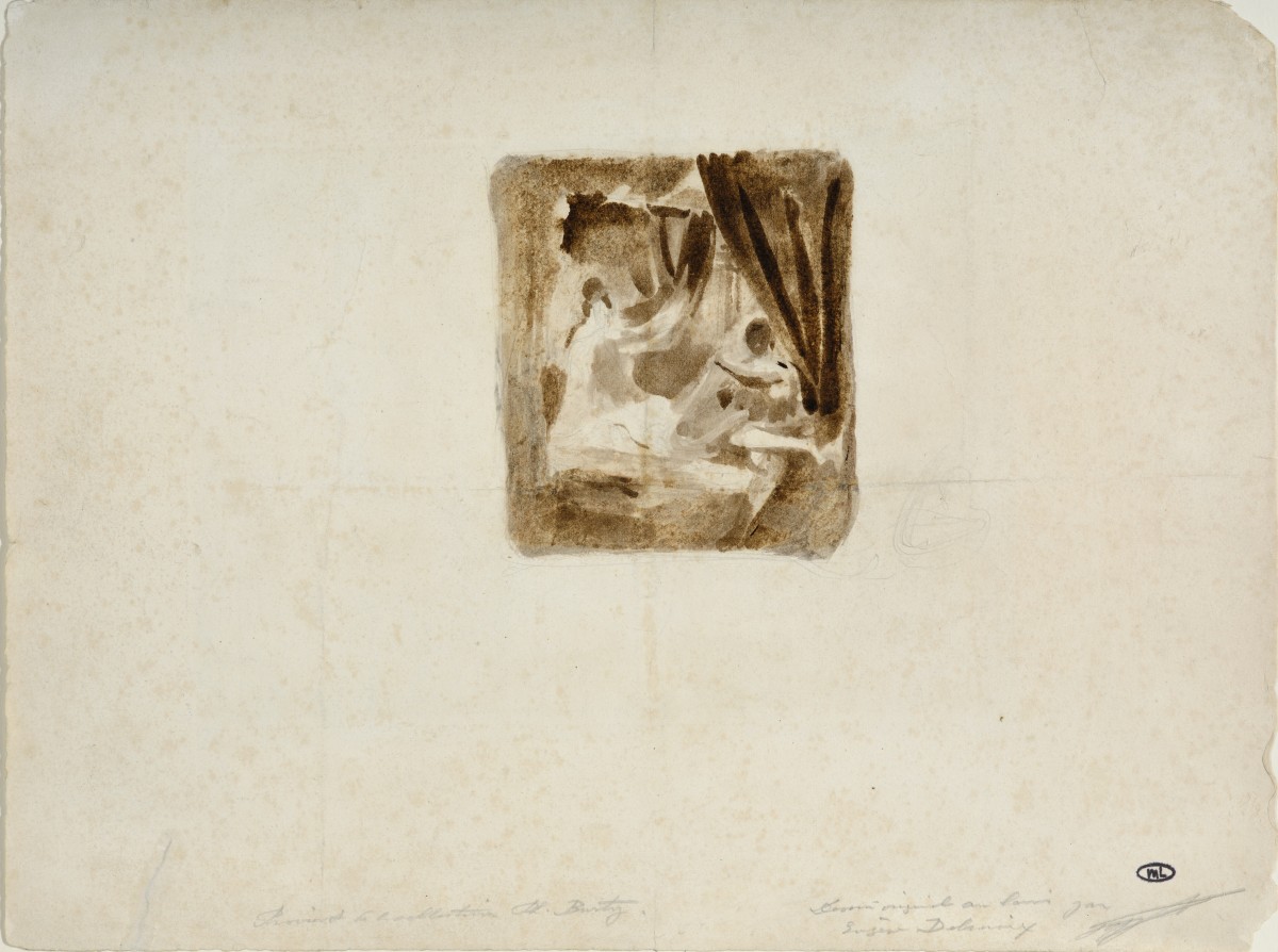 Dans notre étude, nous retrouvons les deux principaux protagonistes, le duc et son chambellan, qui se font face dans le huis-clos d’une alcôve bordée de lourds rideaux. Alors que le duc, assis sur la droite dans une position assez désinvolte lui dévoile sa maîtresse, le chambellan trahit sa surprise par un geste de son bras gauche, qui sera remplacé par un mouvement beaucoup plus doux (suggérant peut-être la douce contemplation des beautés qui lui sont révélées) dans la version peinte. Pour la maîtresse, Delacroix s’en tient à l’essentiel : d’une touche de sépia, il évoque sa tête cachée dans l’ombre derrière le drap, et d’un fin trait de pinceau en forme de vague, ses formes voluptueuses mises à nu …