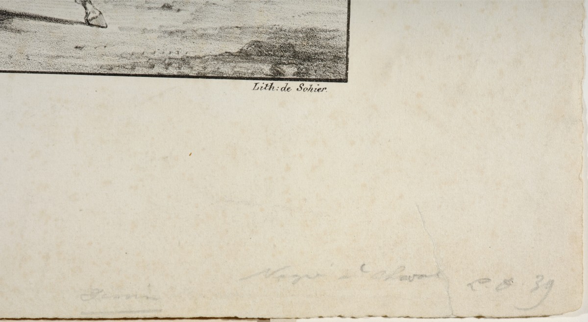 Un an plus tard, en 1823, Delacroix publie sa première lithographie « artistique » qui se démarque de ses productions antérieures, constituées principalement de caricatures satiriques. L’estampe dont le verso a été utilisé pour notre dessin est un tirage de piètre qualité, décentré et penché par rapport à la feuille ce qui suggère qu’il pourrait s’agir d’un des tous premiers tirages réalisé avant le règlement définitif de la presse lithographique.