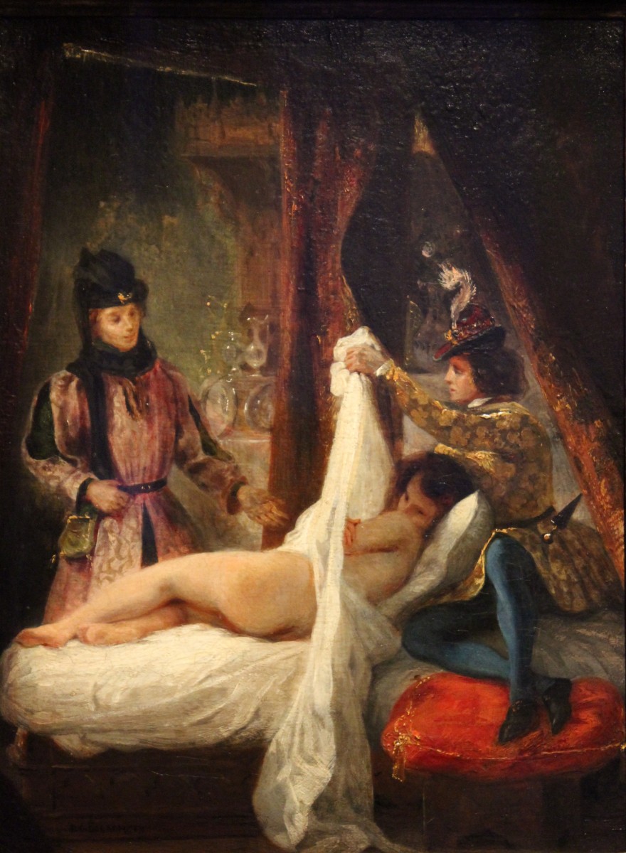 ... à son retour d’Angleterre (dernière photo de la galerie). Il met en scène Louis 1er d’Orléans (reconnaissable à sa veste brodée de fleurs de lys) qui présente à son chambellan Aubert Le Flamenc le corps dénudé de sa maîtresse Mariette d’Enghien (dont la tête reste cachée de la vue de ce dernier), et ce alors que celle-ci n’est autre … que la propre femme du chambellan ! L'anecdote trouve son inspiration littéraire dans un épisode de l'Histoire des ducs de Bourgogne de Prosper de Barante (republiée en 1824) ; cet épisode figure également dans la Vie des dames galantes de Brantôme (republiée en 1822). Certains commentateurs y ont vu également une allusion voilée à la jeunesse de Delacroix, qui aurait en 1822-1823 partagé avec son ami Soulier la même maîtresse, Madame de Pron.