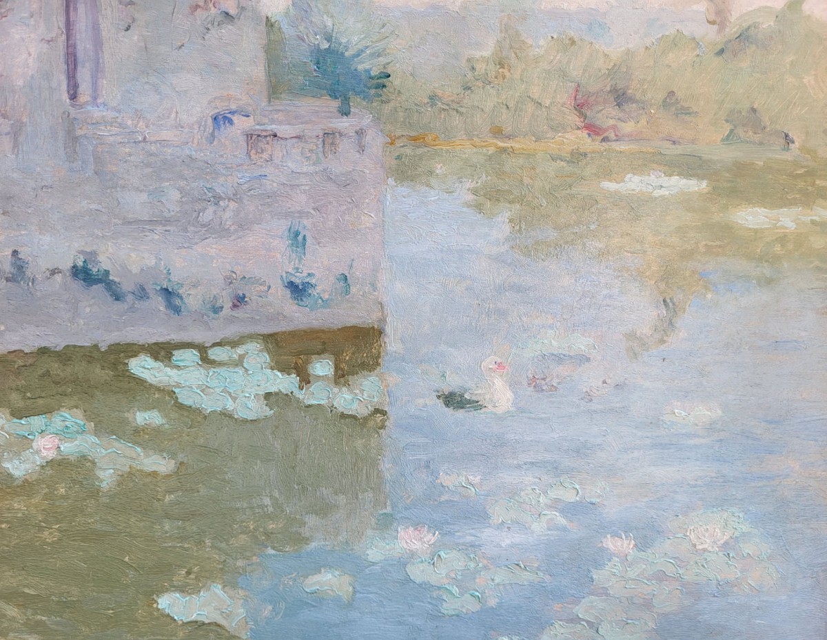 La palette claire, dominée par des tons pastel et des accords subtils de bleus, de verts et de roses, traduit une recherche harmonique typique du post-impressionnisme.