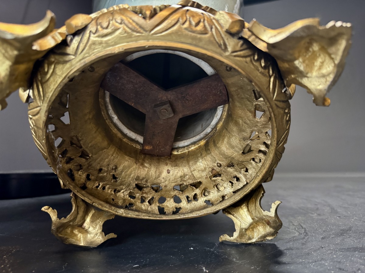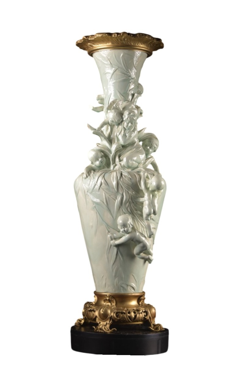 Les montures en bronze doré, finement ciselées et dorées au feu, soulignent l’élégance sculpturale de l’ensemble et rehaussent l’éclat soyeux de la glaçure.