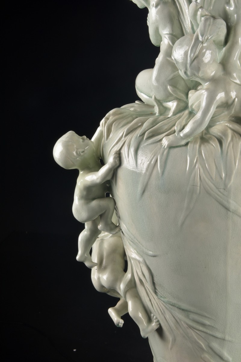 Cette pièce monumentale présente une composition en haut relief d’une figure féminine entourée de putti espiègles émergeant gracieusement d’un enchevêtrement de feuillage.