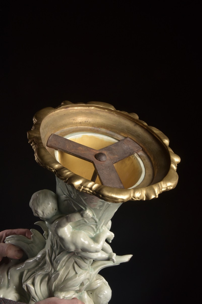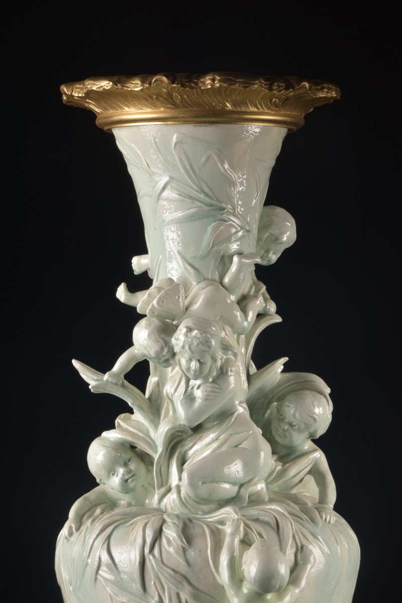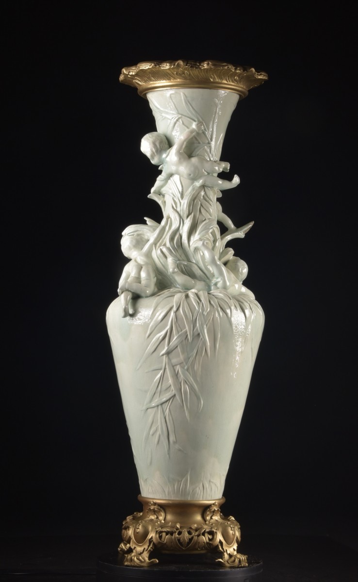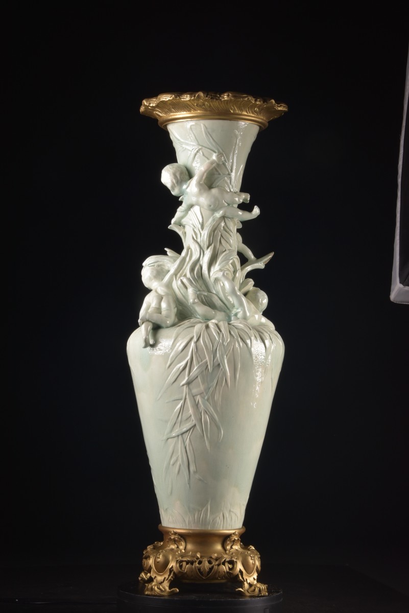 Exceptionnel vase Art Nouveau en fine faïence émaillée orné de montures en bronze doré, France, vers 1900.