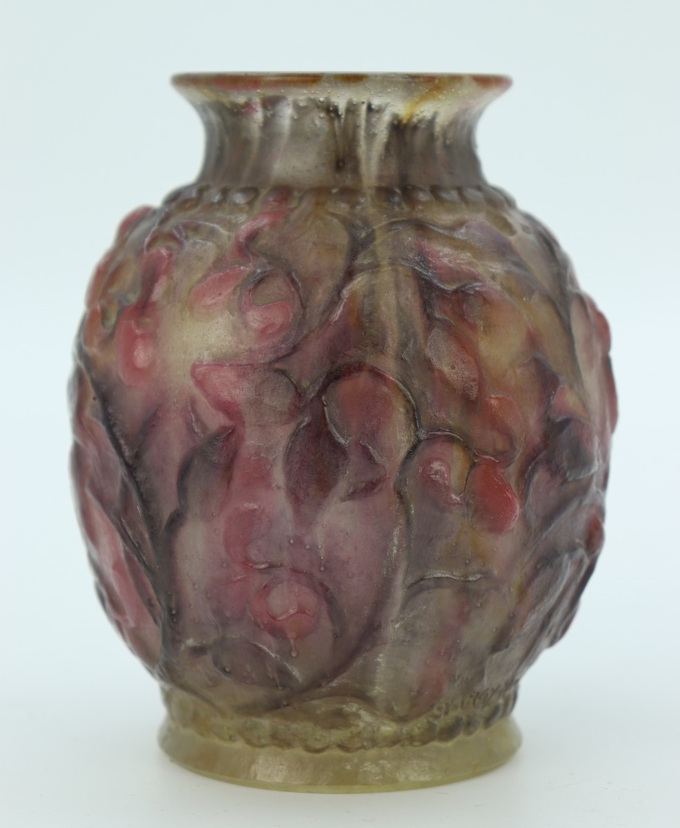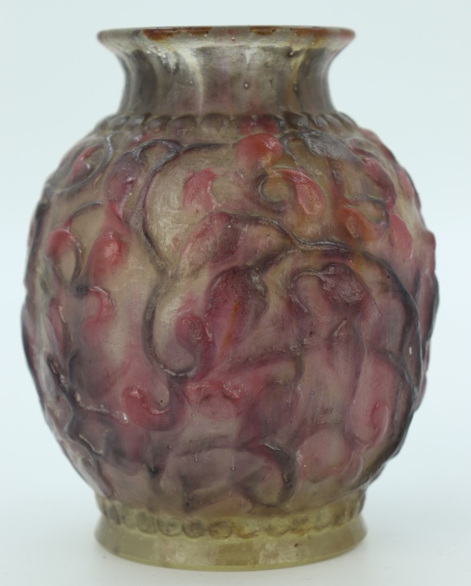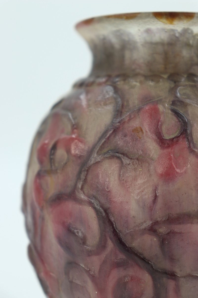 Vase boule en pâte de verre dans les tons roses et mauves à décor de rinceaux souligné de frises de perles. Signé au-dessus du pied.