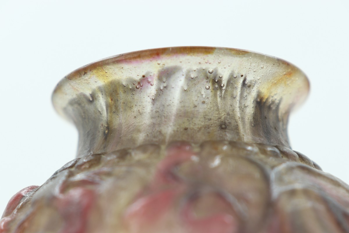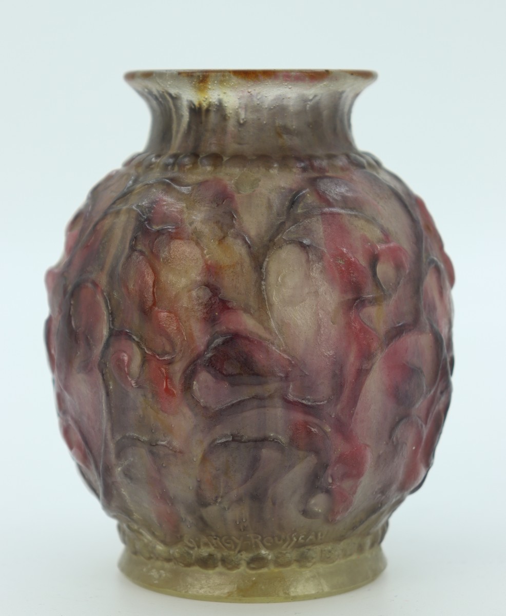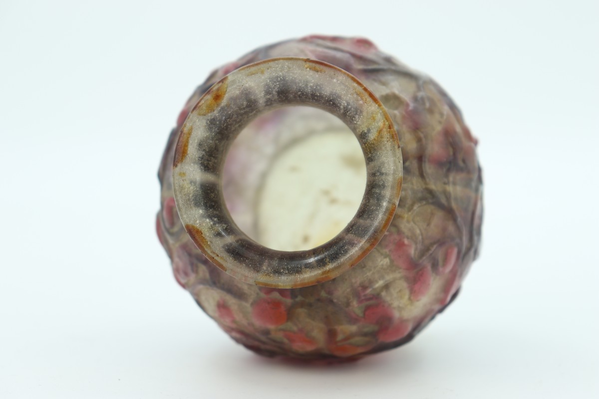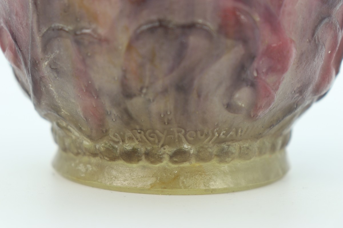 Vase boule en pâte de verre dans les tons roses et mauves à décor de rinceaux souligné de frises de perles. Signé au-dessus du pied.