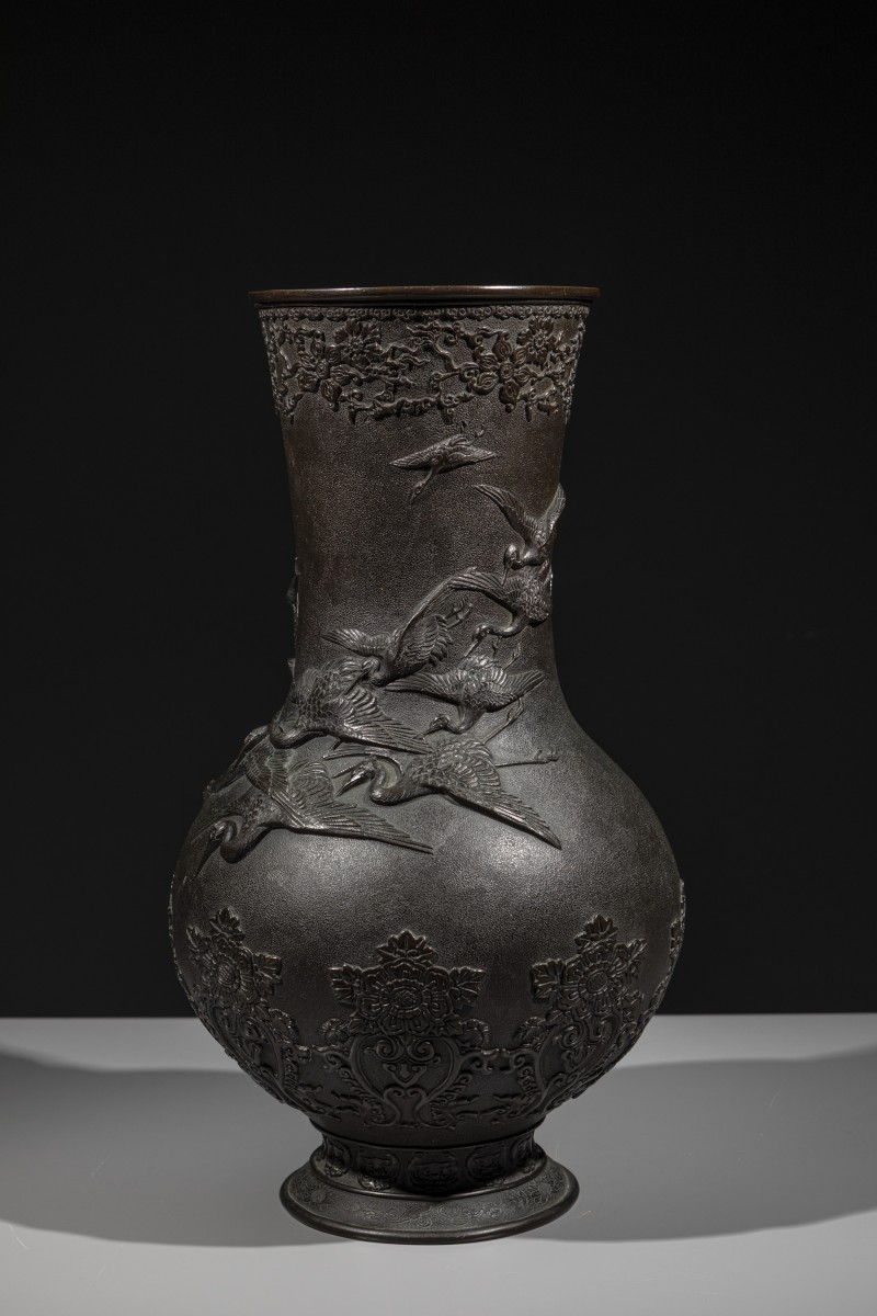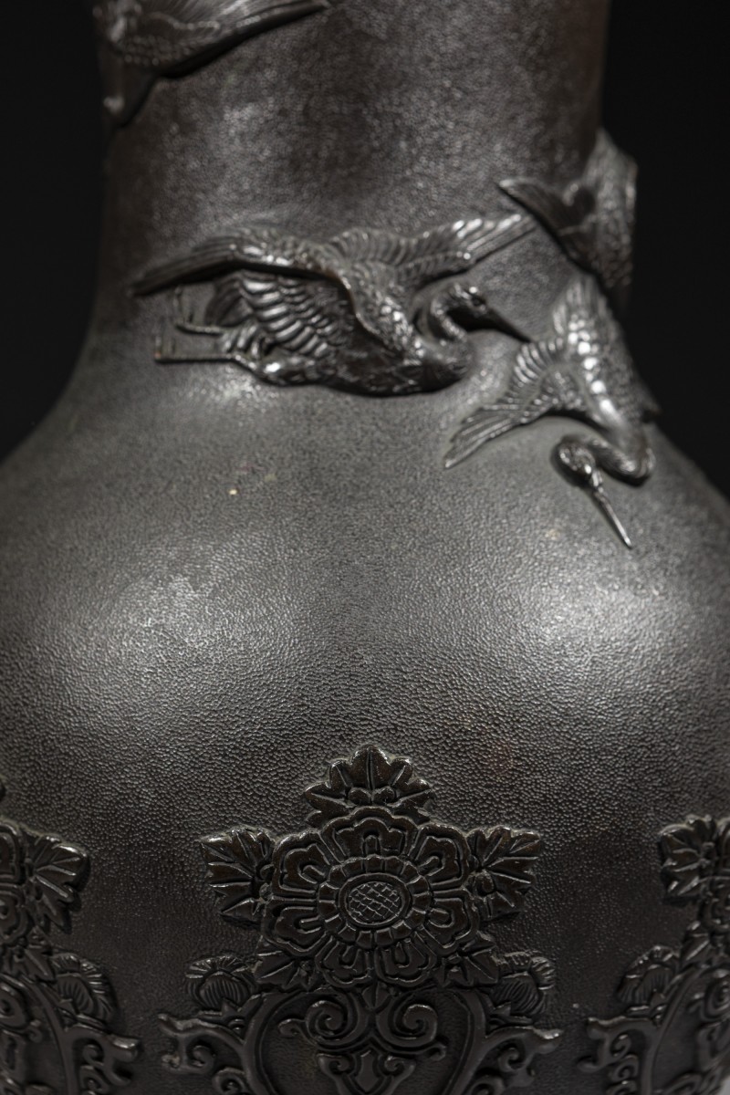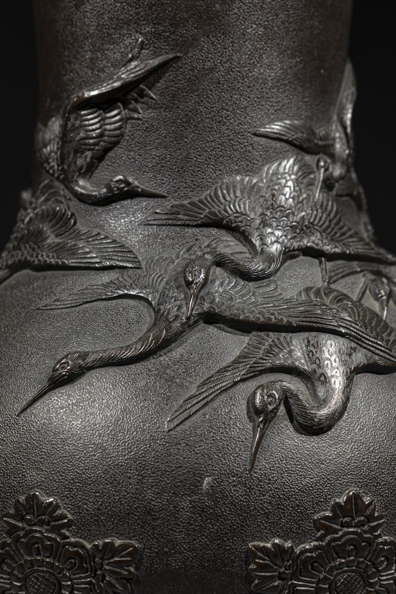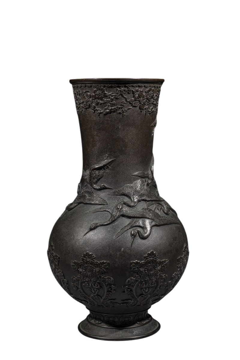 Vase en bronze au corps arrondi et au col haut, à surface finement martelée et décor en relief de grues en vol, signé Miyao. La décoration est dominée par un large groupe de grues de Mandchourie, symbole traditionnel dans l’art japonais, représentées en vol, aux ailes déployées et dans des positions variées. Des motifs floraux ornementaux en relief enrichissent la base et le bord du col, finement définis et contrastant avec le fond martelé. Signature sous la base.