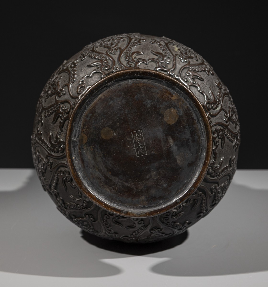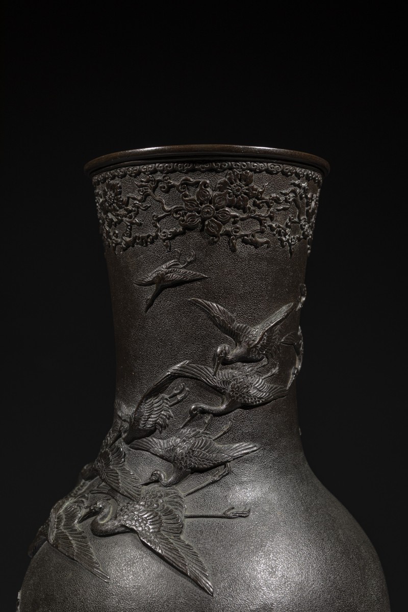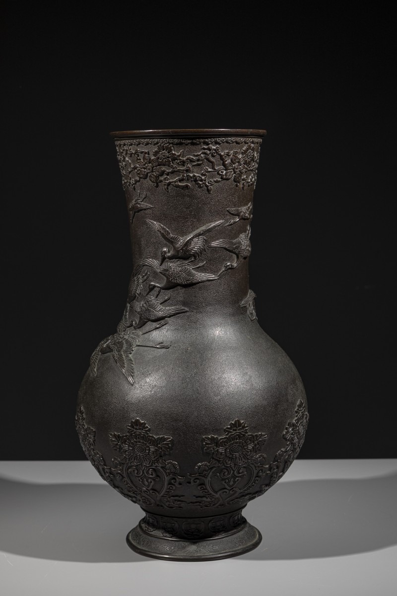 Vase en bronze au corps arrondi et au col haut, à surface finement martelée et décor en relief de grues en vol, signé Miyao. La décoration est dominée par un large groupe de grues de Mandchourie, symbole traditionnel dans l’art japonais, représentées en vol, aux ailes déployées et dans des positions variées. Des motifs floraux ornementaux en relief enrichissent la base et le bord du col, finement définis et contrastant avec le fond martelé. Signature sous la base.