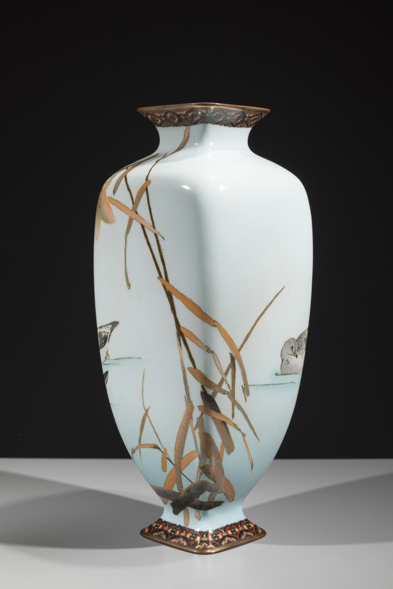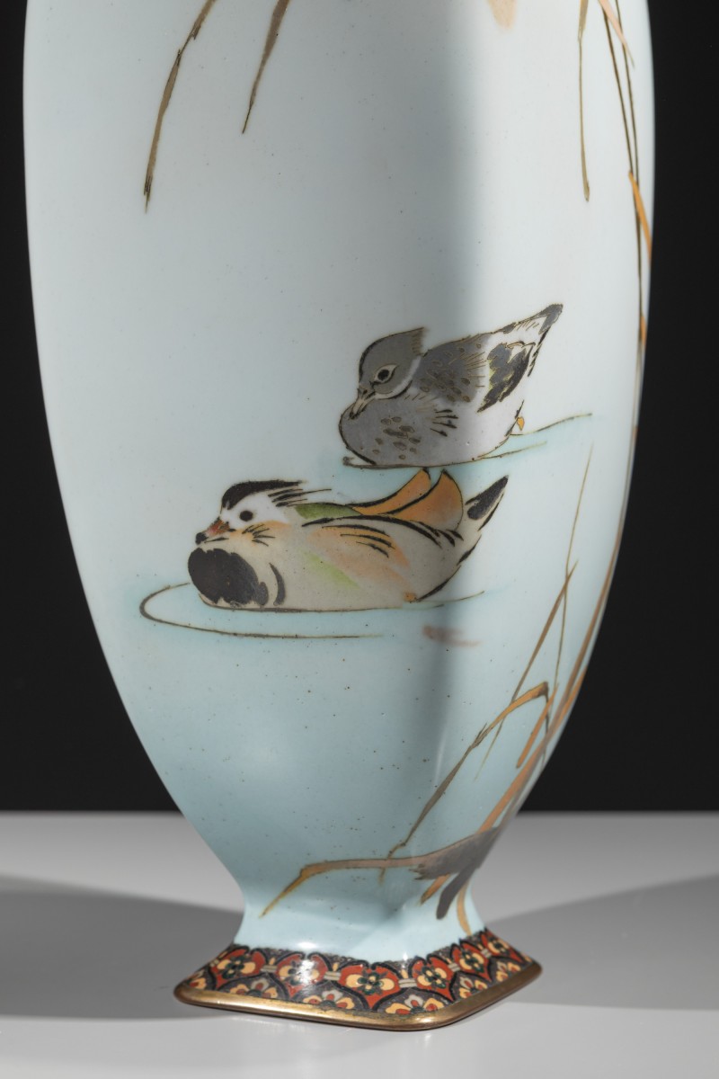Vase cloisonné (shippo) décoré en émaux polychromes, réalisés à la fois avec fil d’argent et sans fil, représentant une scène naturaliste avec une paire de canards nageant le long d’un cours d’eau, encadré par des feuilles de bambou. Le terme shippo désigne la technique de l’émail cloisonné au Japon.