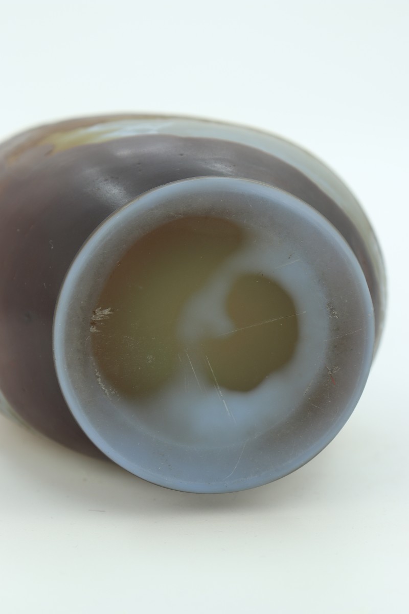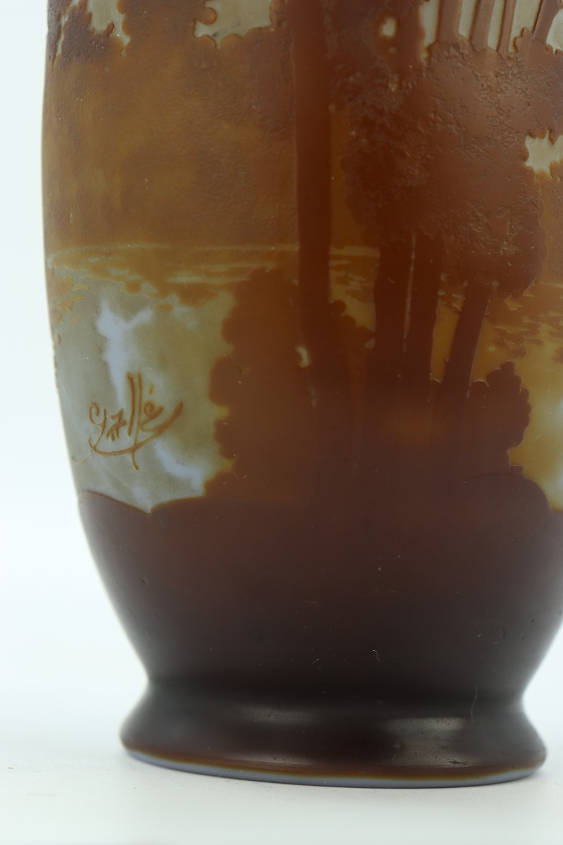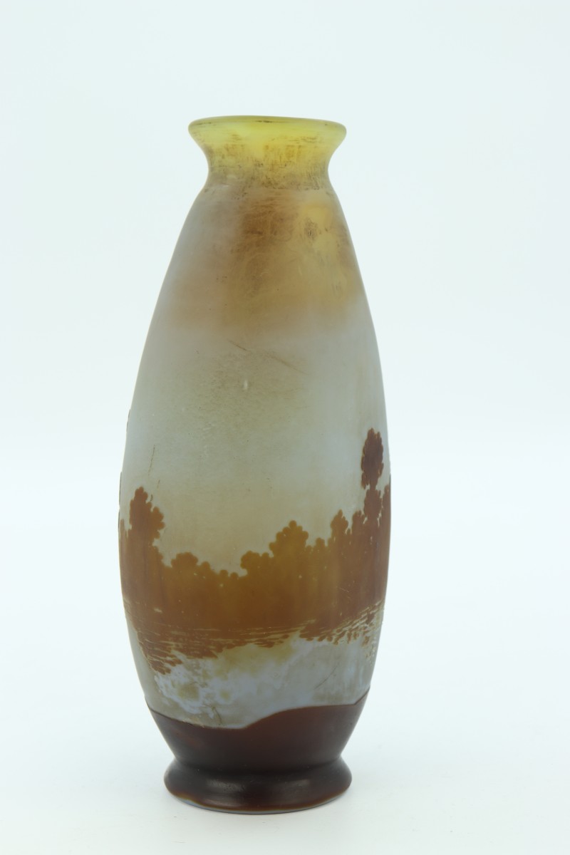 Vase sur talon à pense renflée aplatie et col resserré en verre bicouche brun sur fond bleuté et jaune à décor de paysage lacustre dégagé à l'acide.