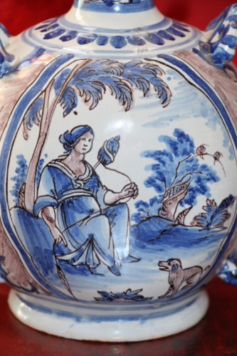 Nevers: Beau vase gourde en faïence traité en bleu et manganèse d'une scène animée de personnages et d'animaux dans un paysage.