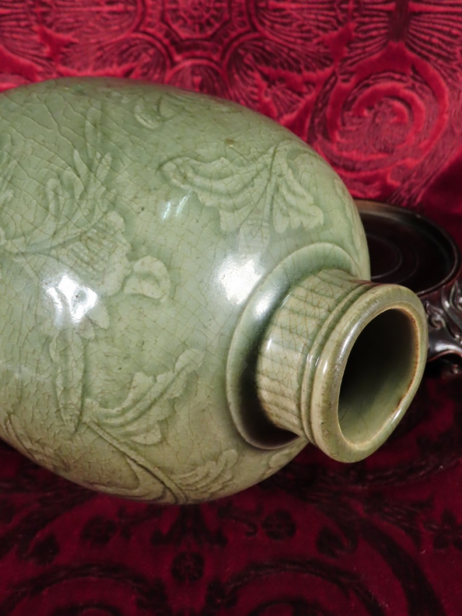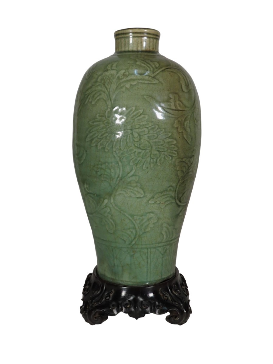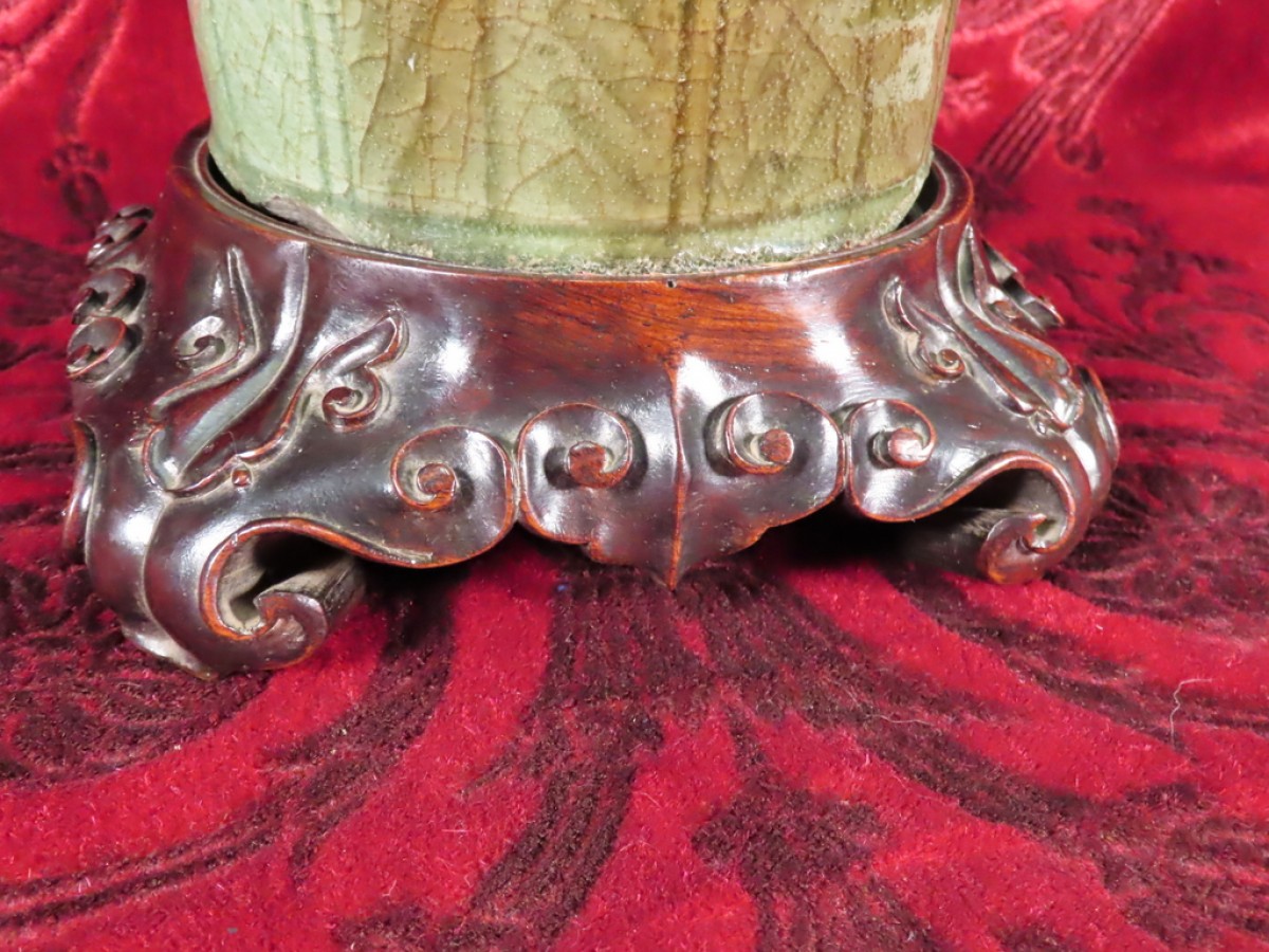 Vase de forme balustre à col rétréci en grés émaillé de couleur vert céladon à décor en relief de fleurs, feuilles et feuillages. Vase posé sur un socle en bois de zitan sculpté à décor de volutes et têtes stylisées. Ce vase présente des éclats en pourtour de la base, visibles sur les photos. Vase d’époque King XIXe Siècle.