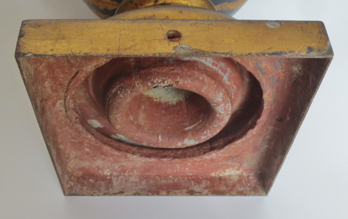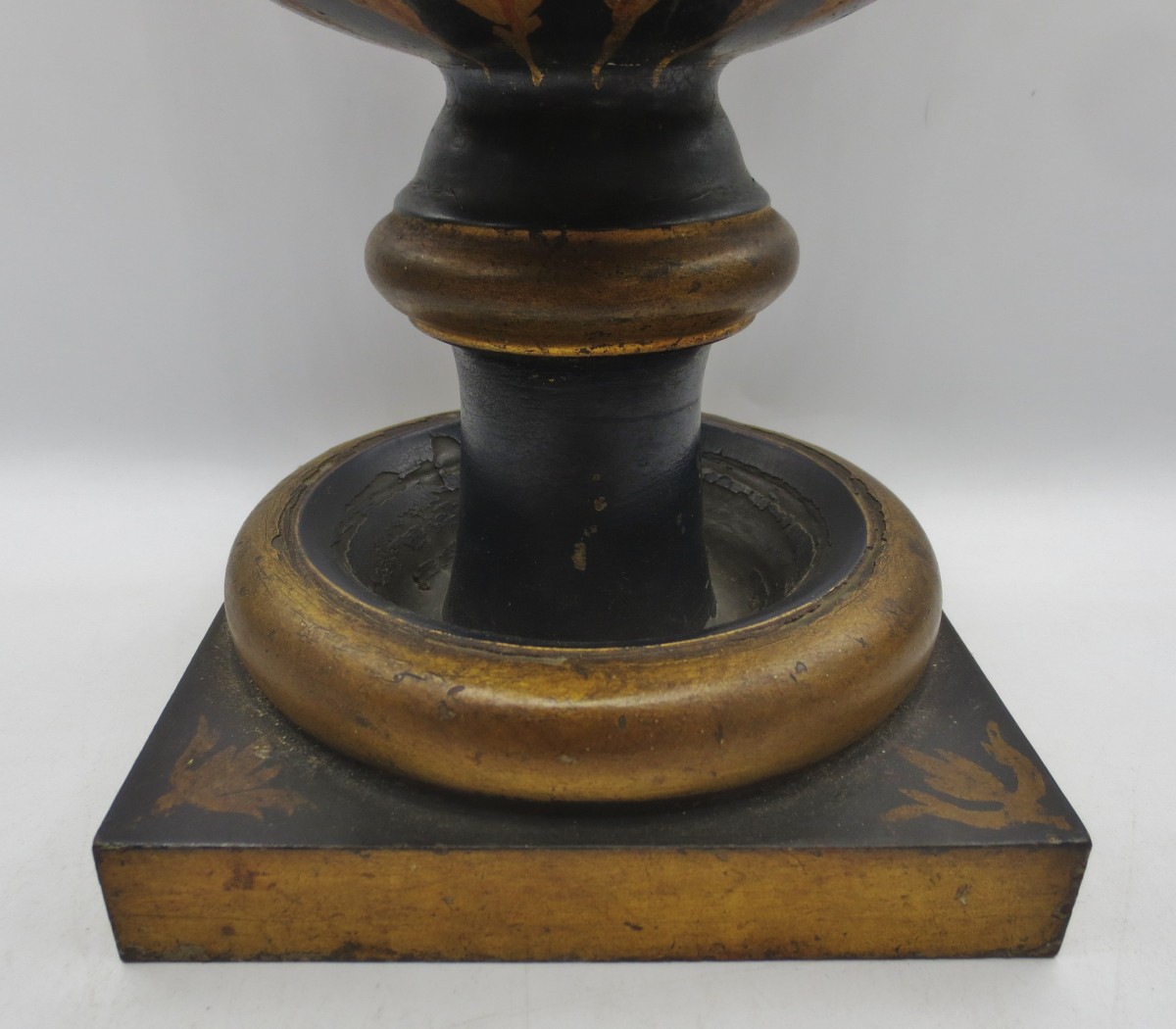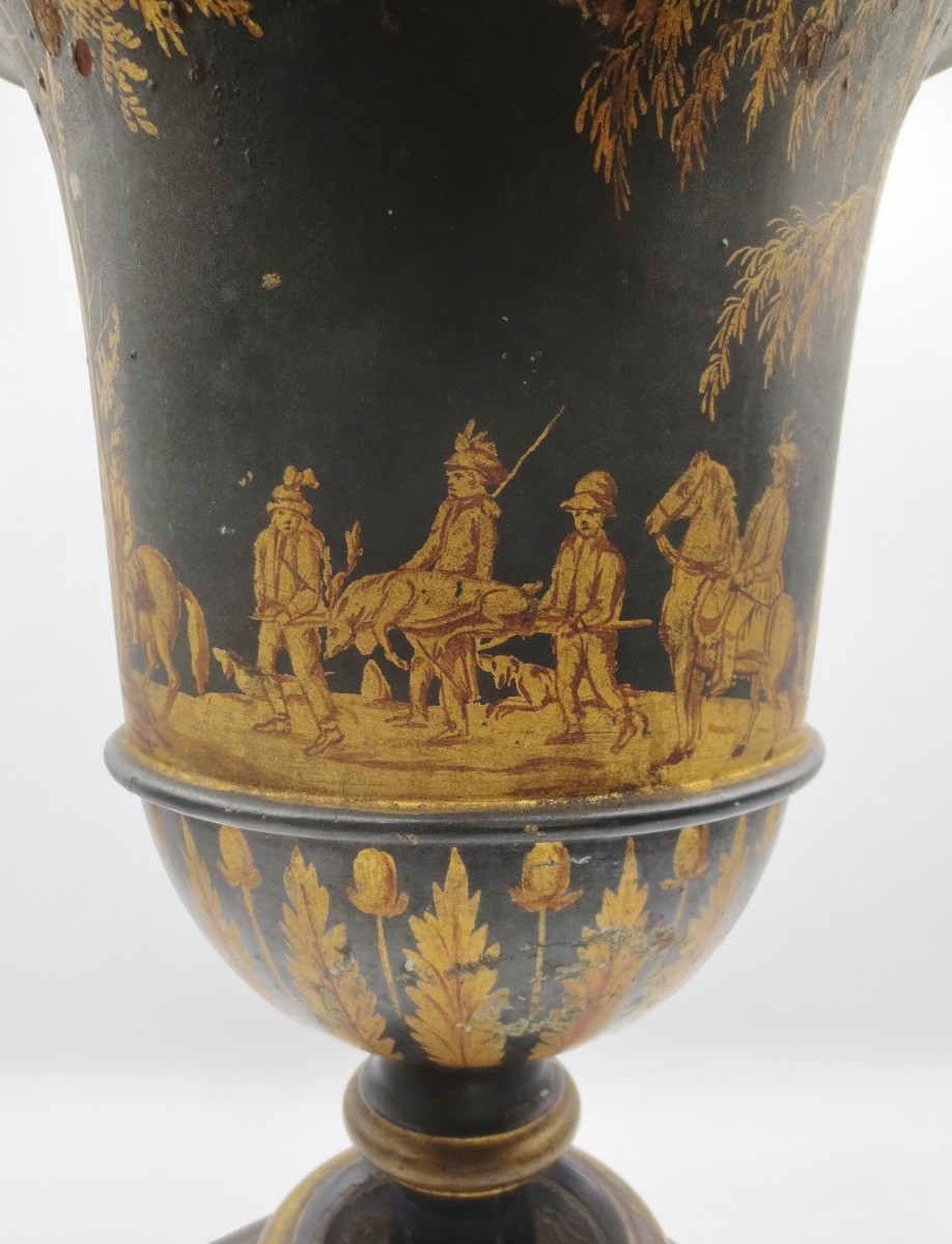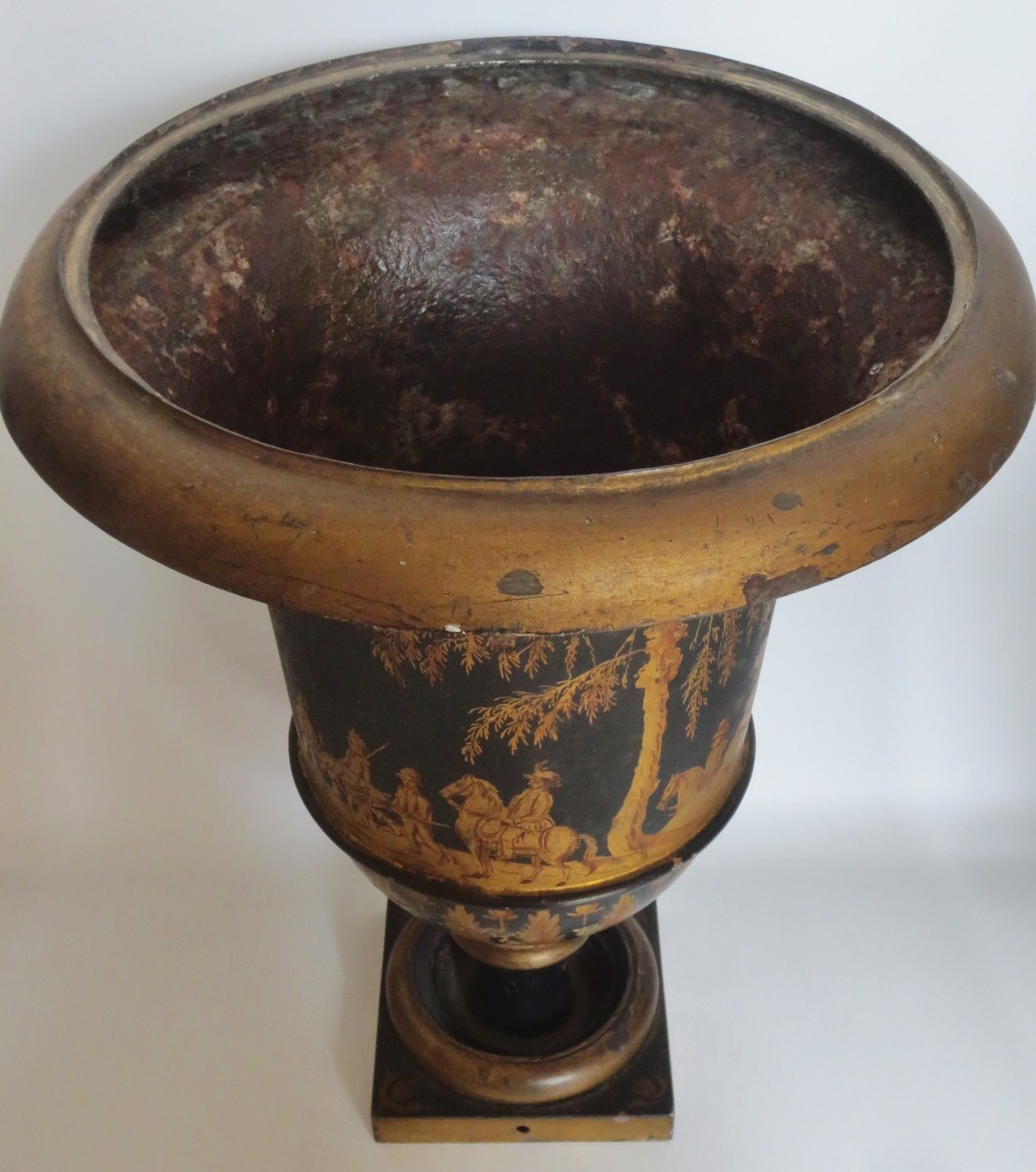 Ce très beau vase est en tôle, il est peint d'une superbe scène de chasse de couleur or sur fond noir, le décor tourne tout autour de la panse, quelques cavaliers se dirigent vers une demeure, ils viennent de chasser et sont accompagnés par des valets à pied qui portent un cerf sur un brancard. La base du vase est peinte de longues feuilles intercalées de fleurs en bouton. L' ensemble repose sur un piédouche et un socle carré. Ce vase avait été autrefois électrifié , nous avons démonté le système qui ne présentait que peu d’intérêt à notre avis, il devait posséder un couvercle qui a disparu lors de l' électrification de l' objet.