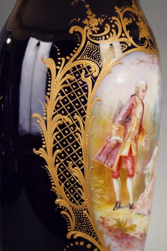 Une scène galante dans le goût du XVIIIème siècle signée : A.GRISARD , se détache dans une réserve entourée de rehauts or sur fond bleu de four.